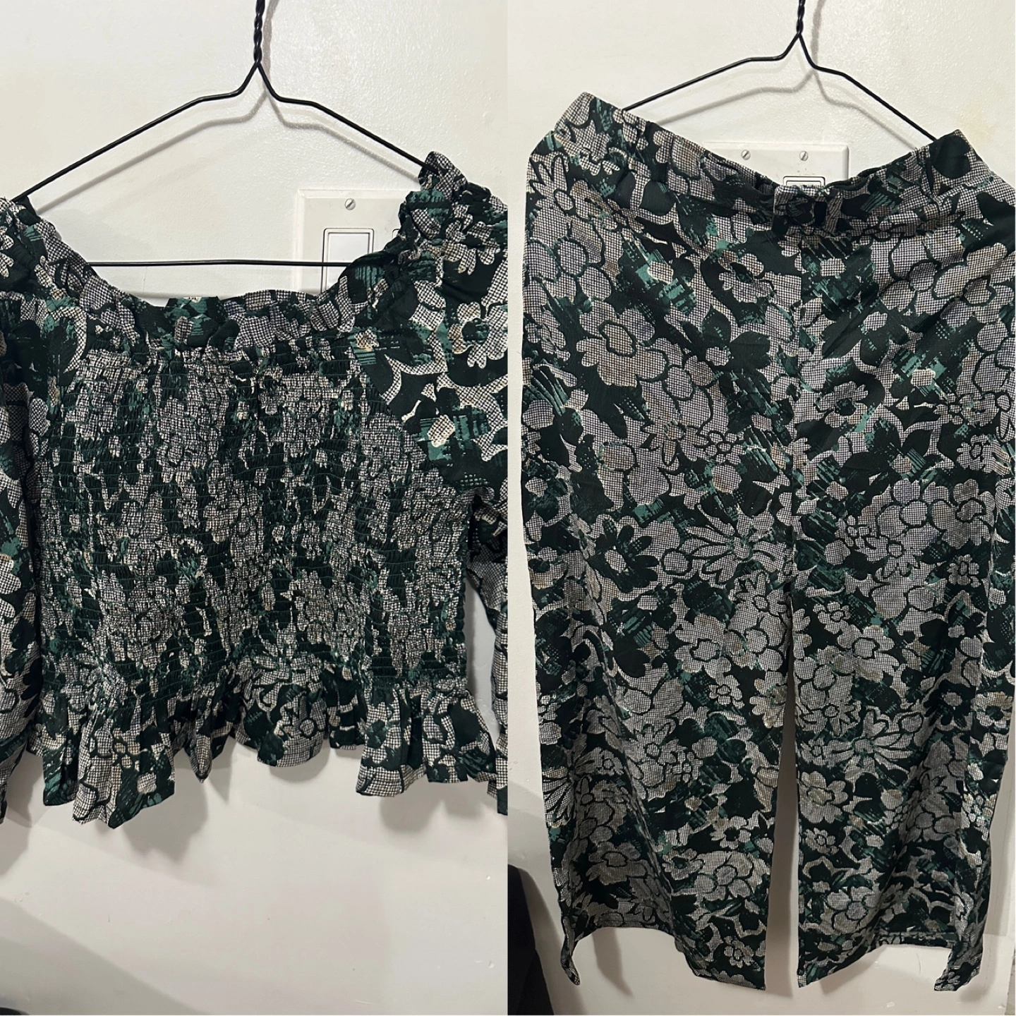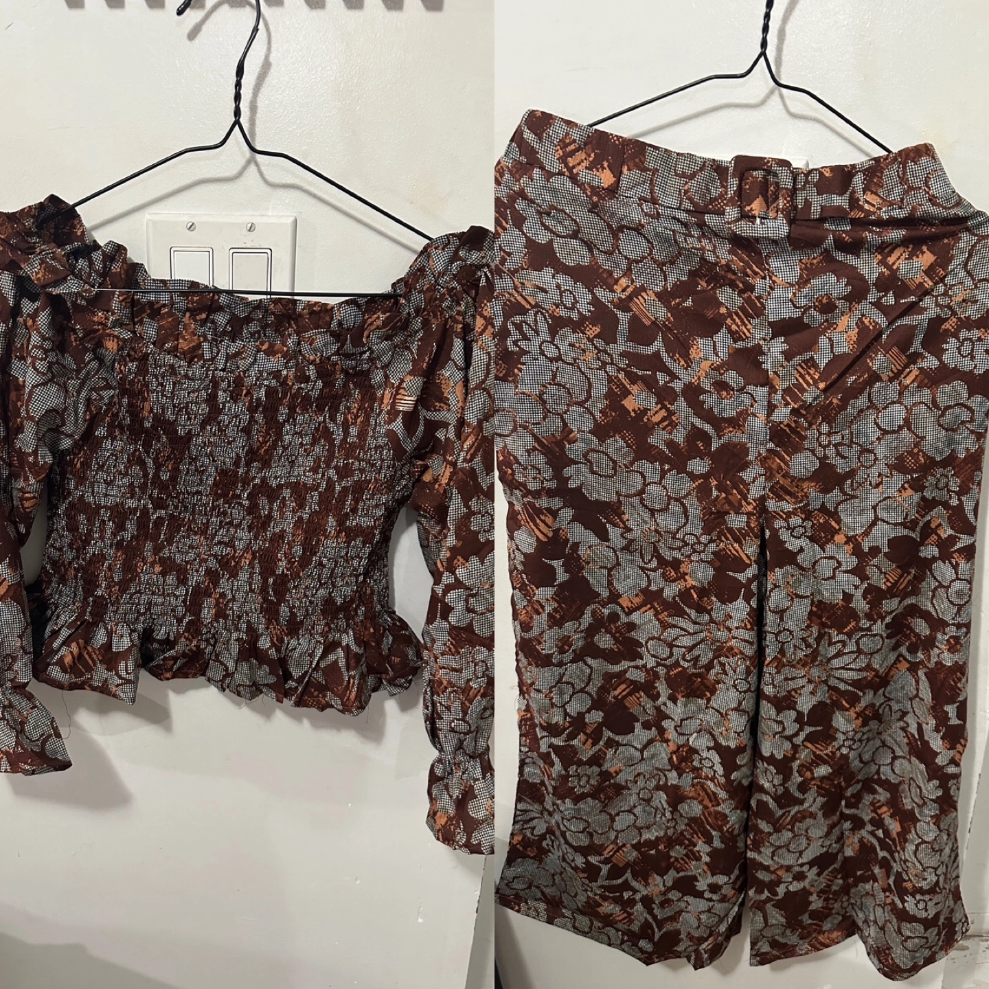 Two-piece set. Includes a top and shorts. Floralw design throughout the set. Long sleeves. Could be worn for a relaxing day at home.