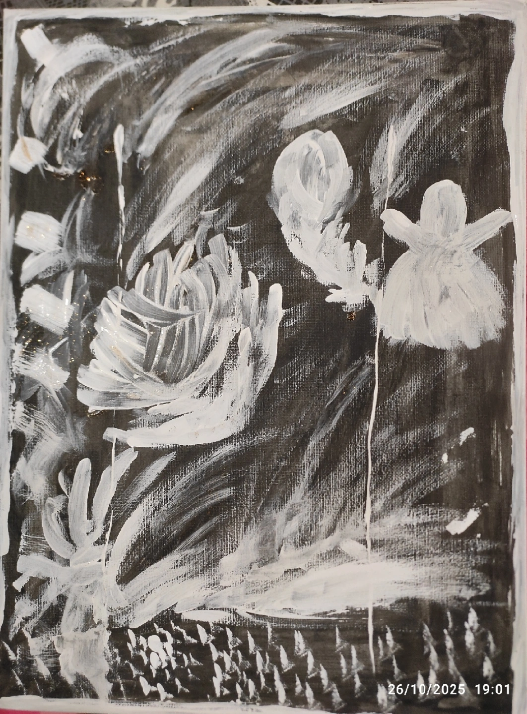 12This is a floral painting with white flowers on a black background. made by me. I can make sketches also.