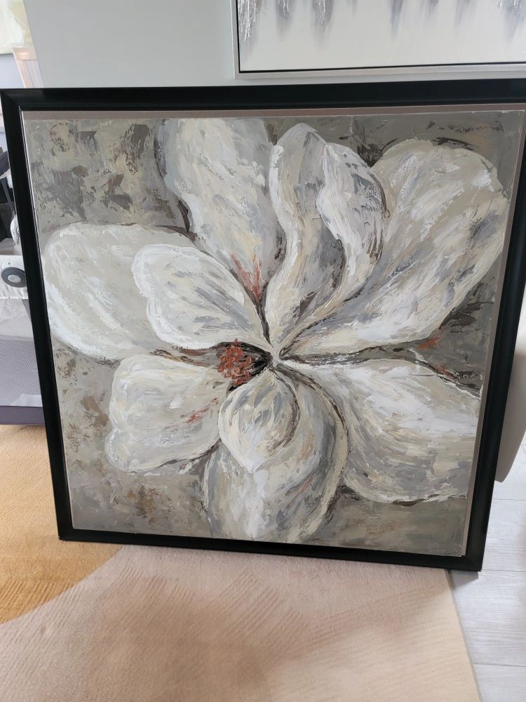 A lovely floral painting, ready to brighten up any room! The painting features a beautiful white flower with neutral tones, set against a textured background. It comes with a sleek black frame, adding a touch of modern elegance to the piece