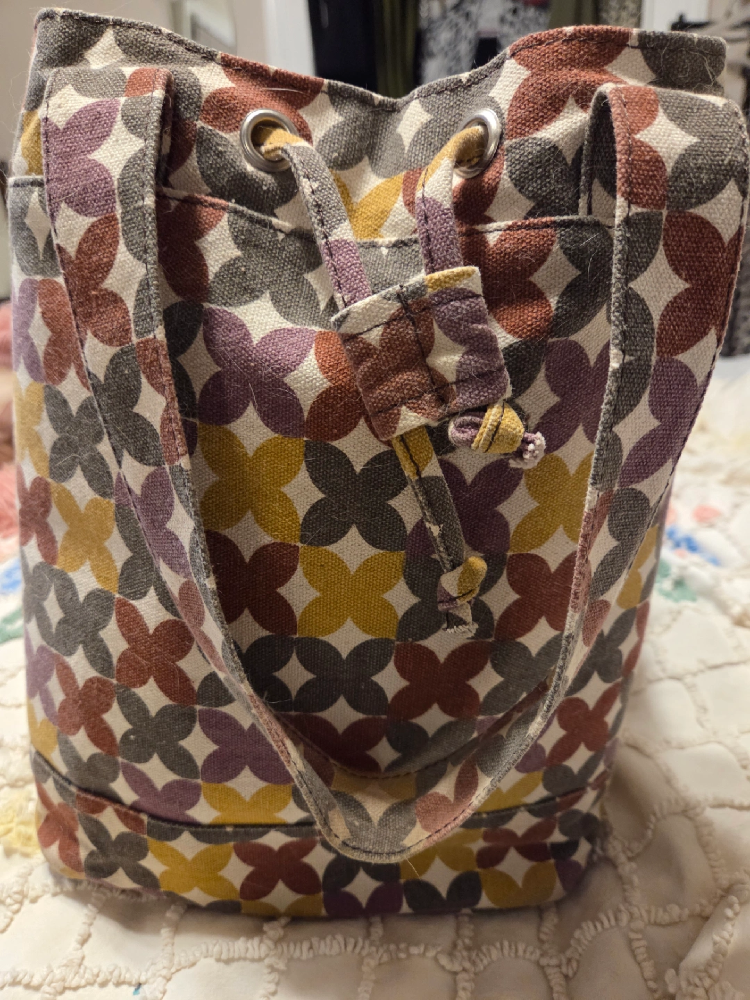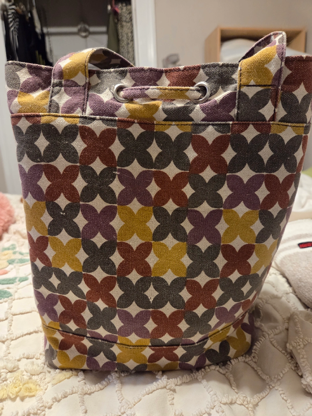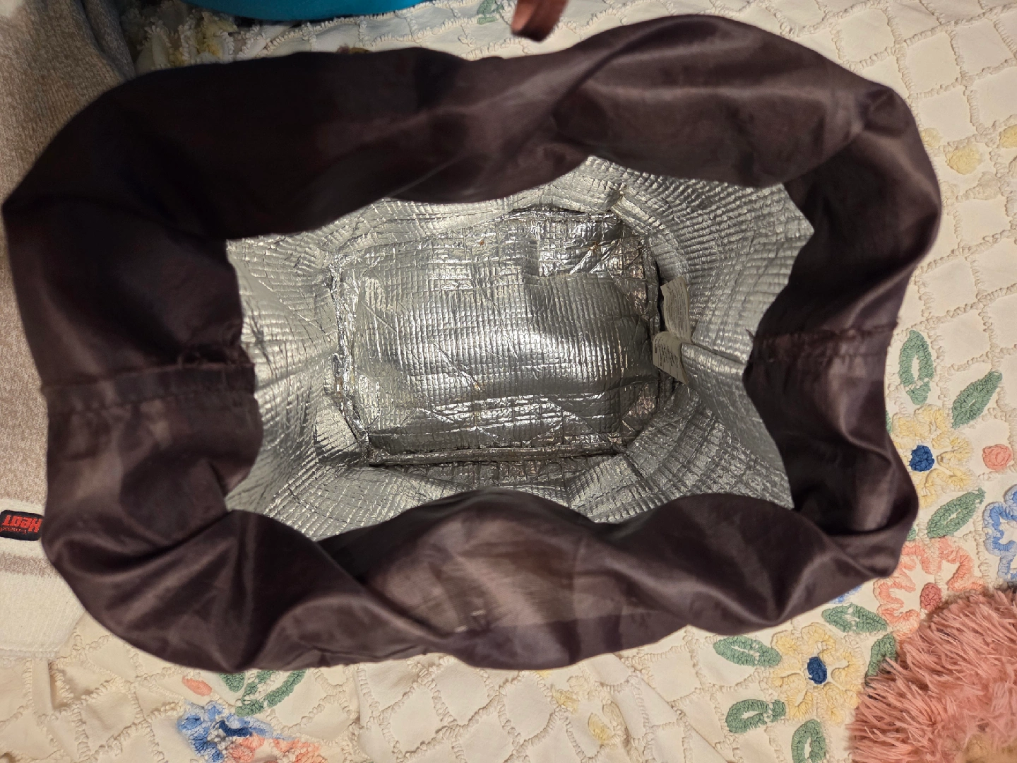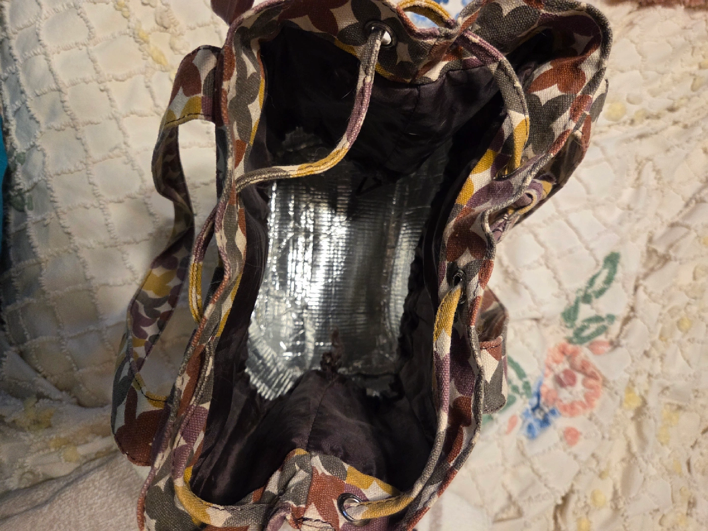 83Here's a cute insulated lunch bag with a floral pattern! It's perfect for keeping your lunch cool on the go. The inside is lined with a silver insulated material. It has a drawstring closure and handles for easy carrying
