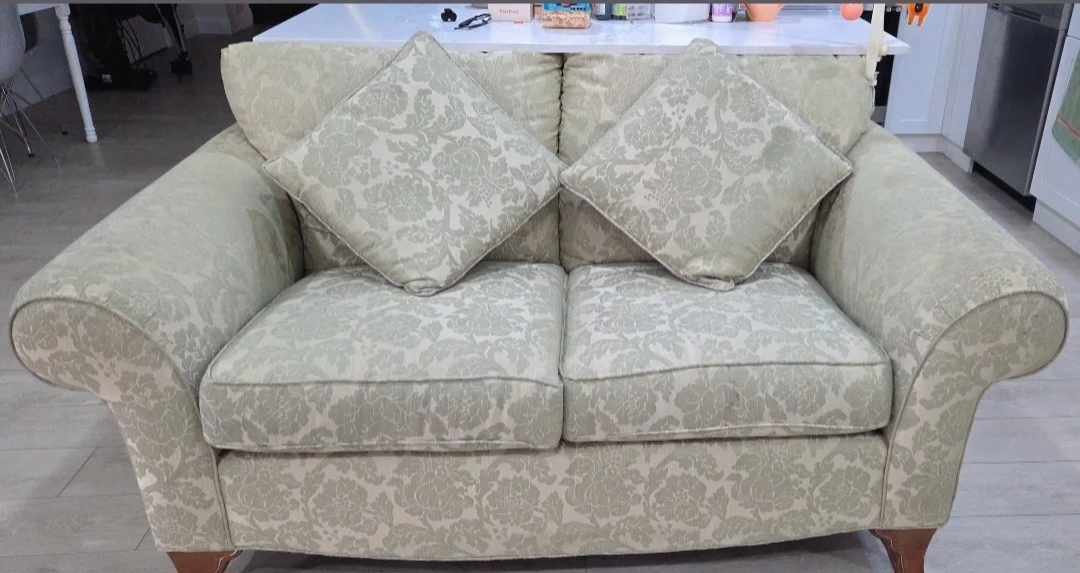 10A comfy loveseat sofa with a floral pattern! It's in good condition and ready for a new home. Perfect for any living room or small space. From a smoke-free and pet-free home. Neutral design that fits most interiors