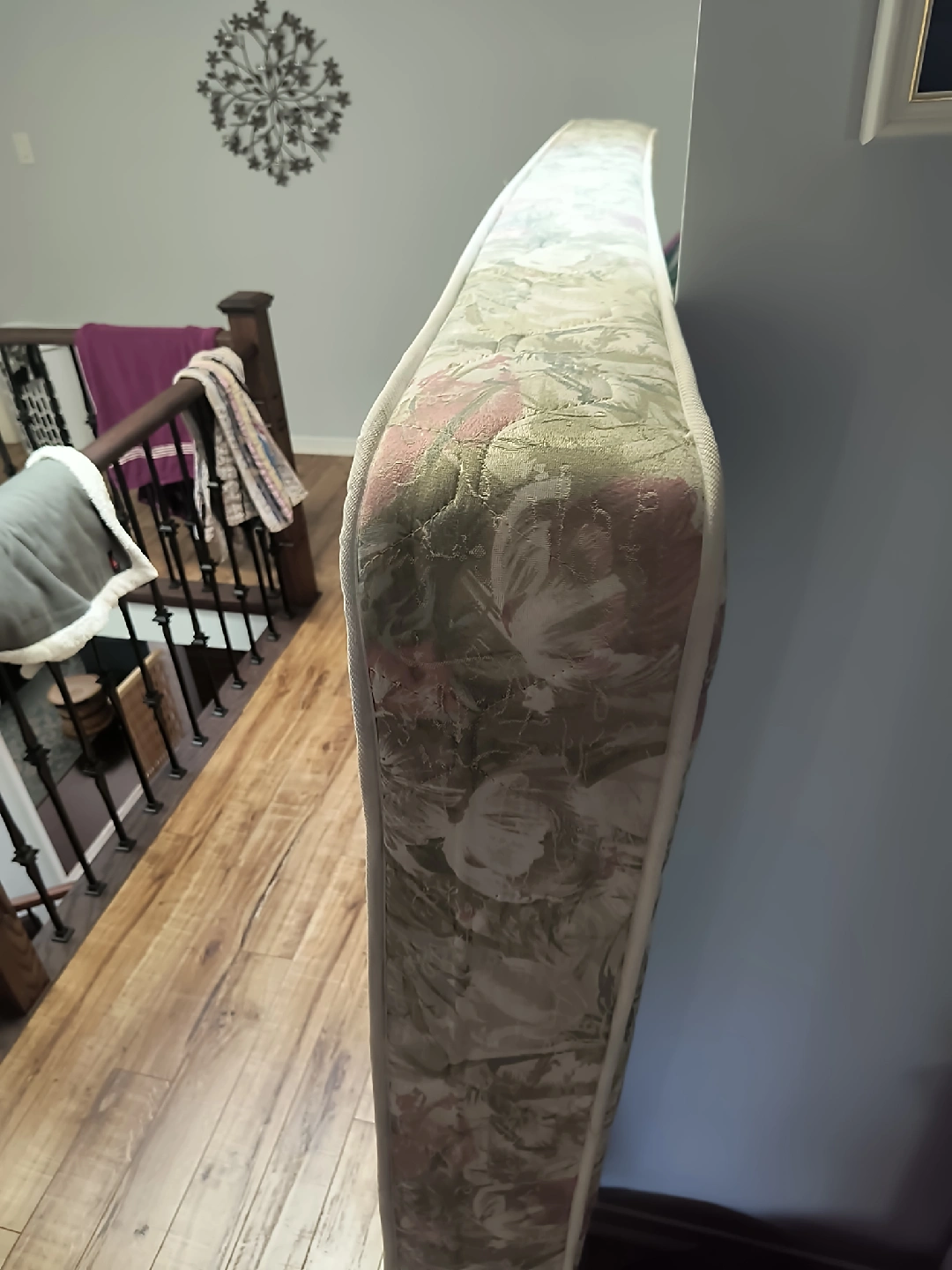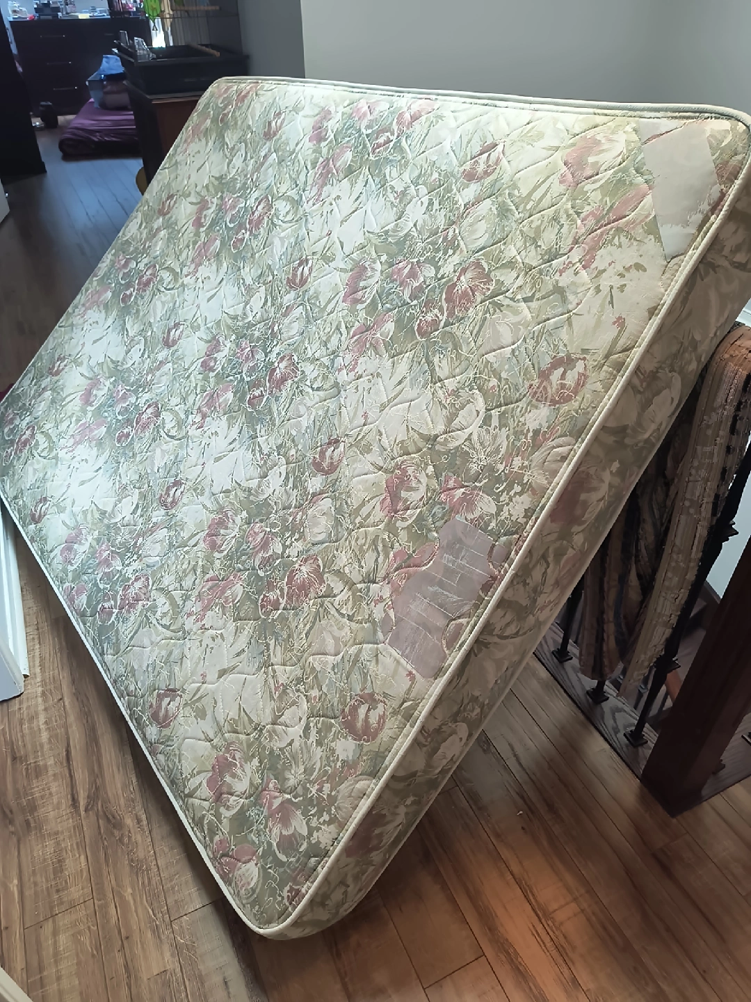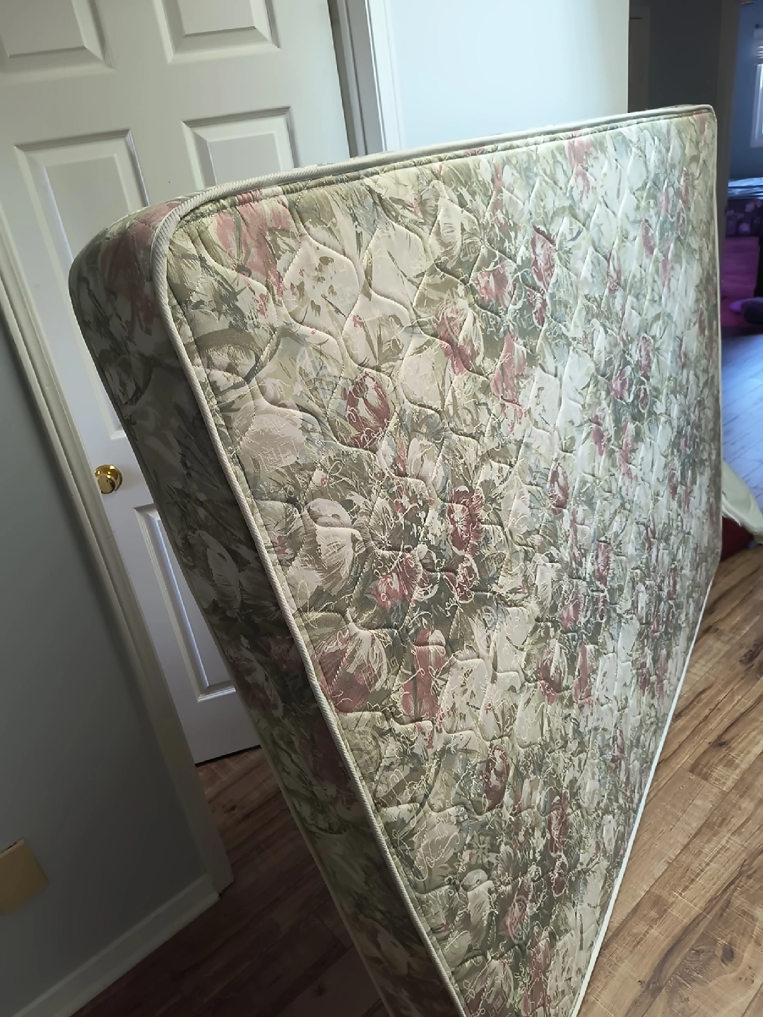 10Selling a mattress with a floral pattern. It's in good condition and ready for a new home. It has a cream, green, and pink floral design.