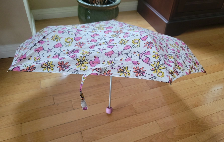 70Here's a cute umbrella with a fun floral pattern! It's perfect for those rainy days and will definitely brighten up your day. The umbrella is in good condition and ready to keep you dry in style