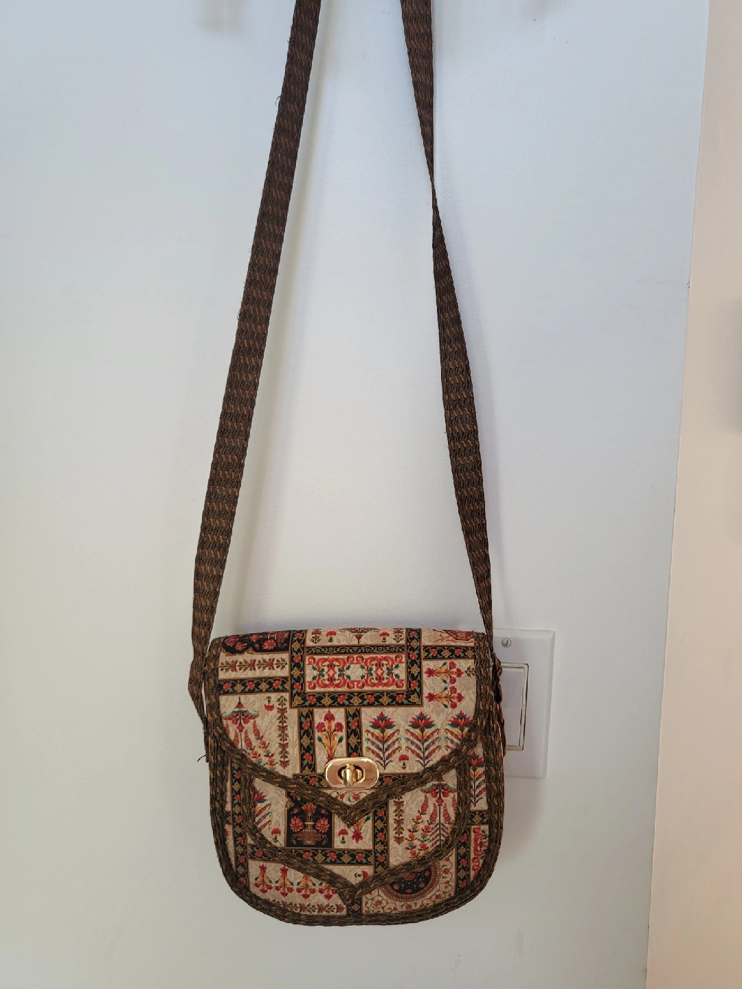 10Selling a cute crossbody bag with a unique floral pattern! It has a zipper and a flap closure. The strap is adjustable, and the interior is lined with a dark brown fabric. It's in great condition and ready for a new home!