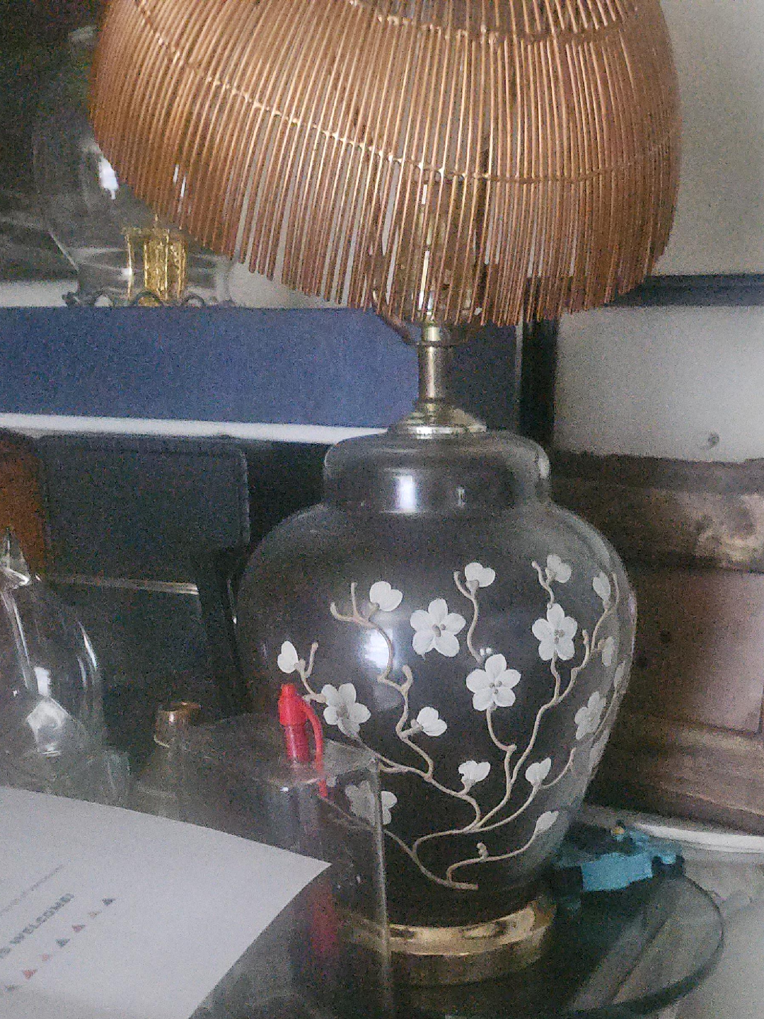 10Here's a lovely table lamp with a unique floral pattern on a dark base. It has a gold-coloured shade that adds a touch of elegance to any room. It's in great condition and ready to brighten up your space!