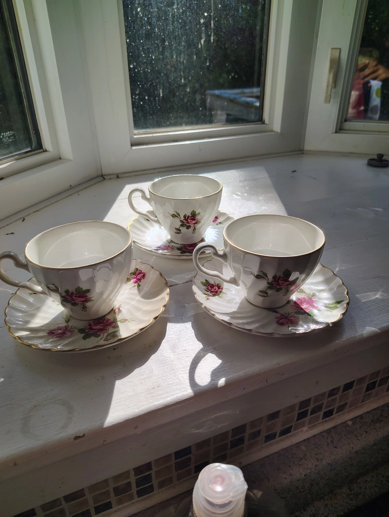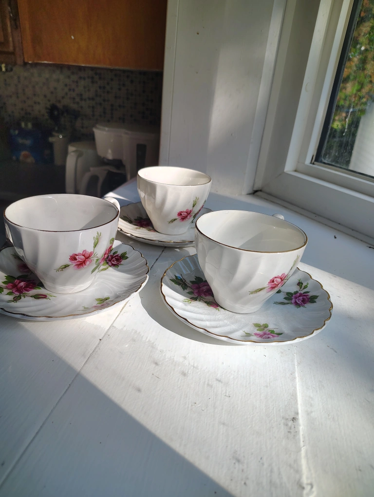 Floral Patterned Tea Cup & Saucer Set In Pre-Owned Condition. Note: 2 Of The Saucers Has Some Crazing On The Glazing. If You're Seeing This Ad, Mean's The Set's Available To Be Picked Up.