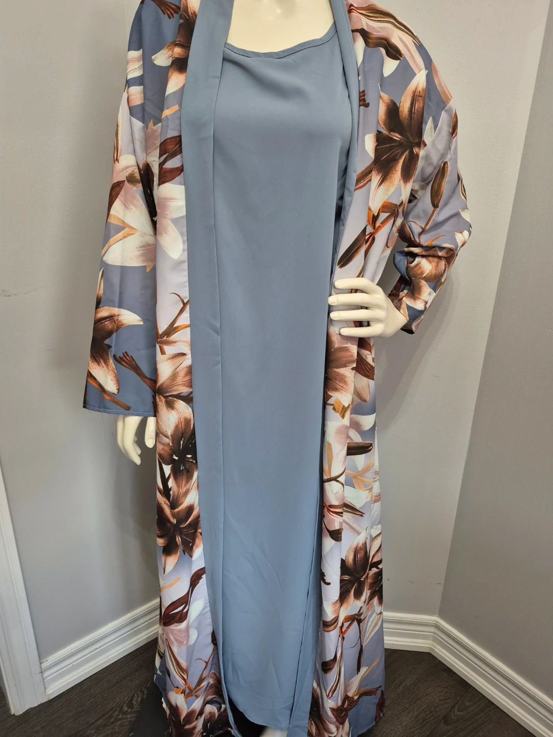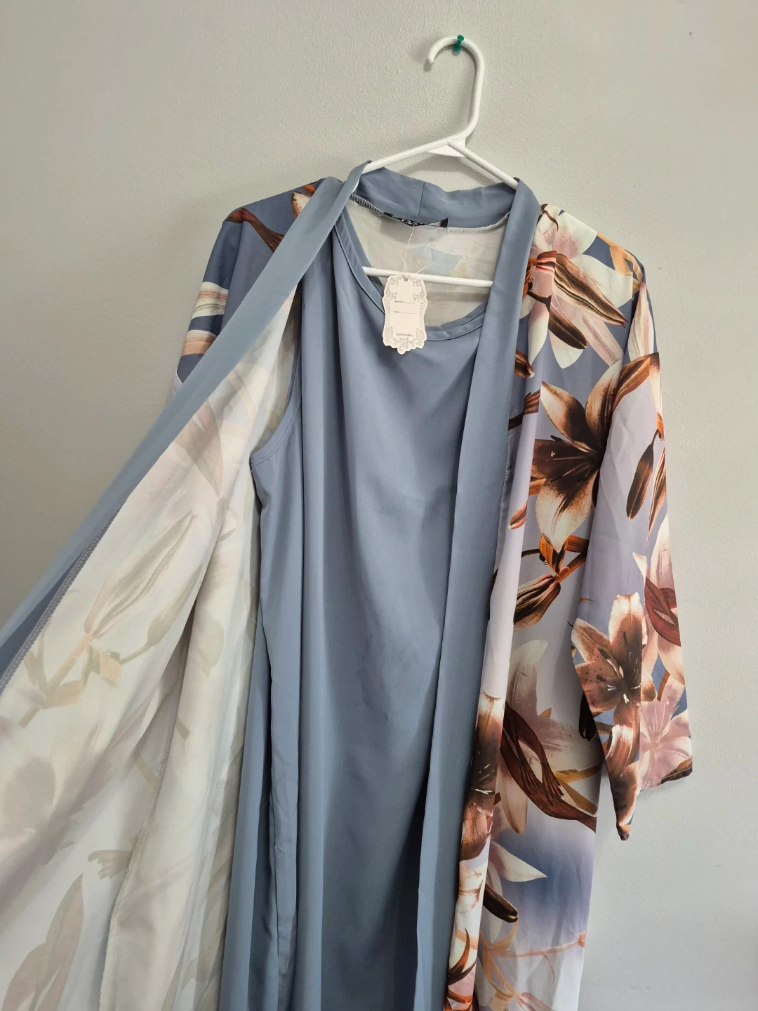 10This is a lovely dress and duster set! The dress is a solid light blue colour, and the duster has a beautiful floral print. Perfect for spring or summer!