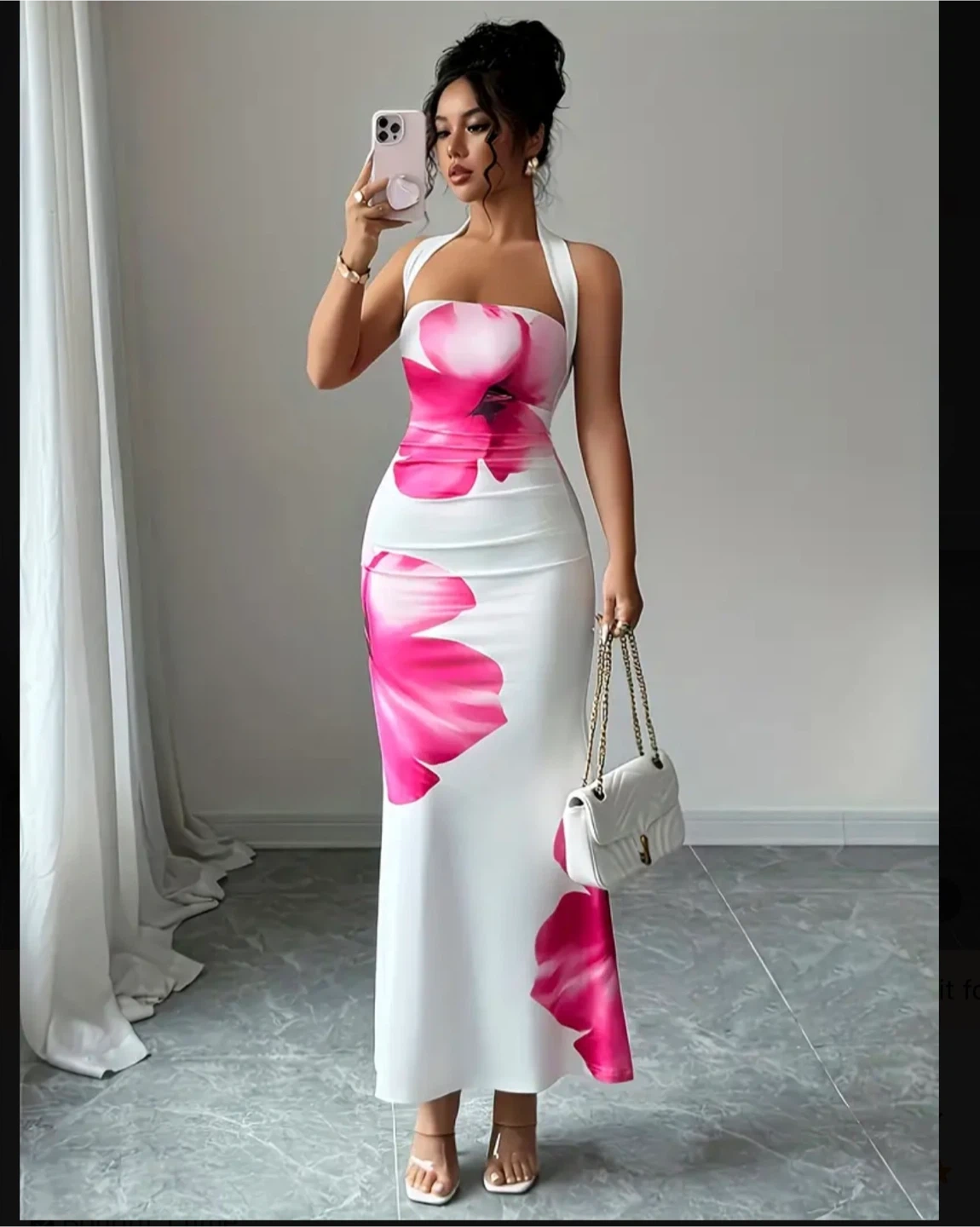 5This dress features a beautiful floral print and a halter neckline. It's a bodycon style, perfect for a night out or a special occasion! The dress is white with pink floral accents. Feel free to DM for more enquiries ππΌ