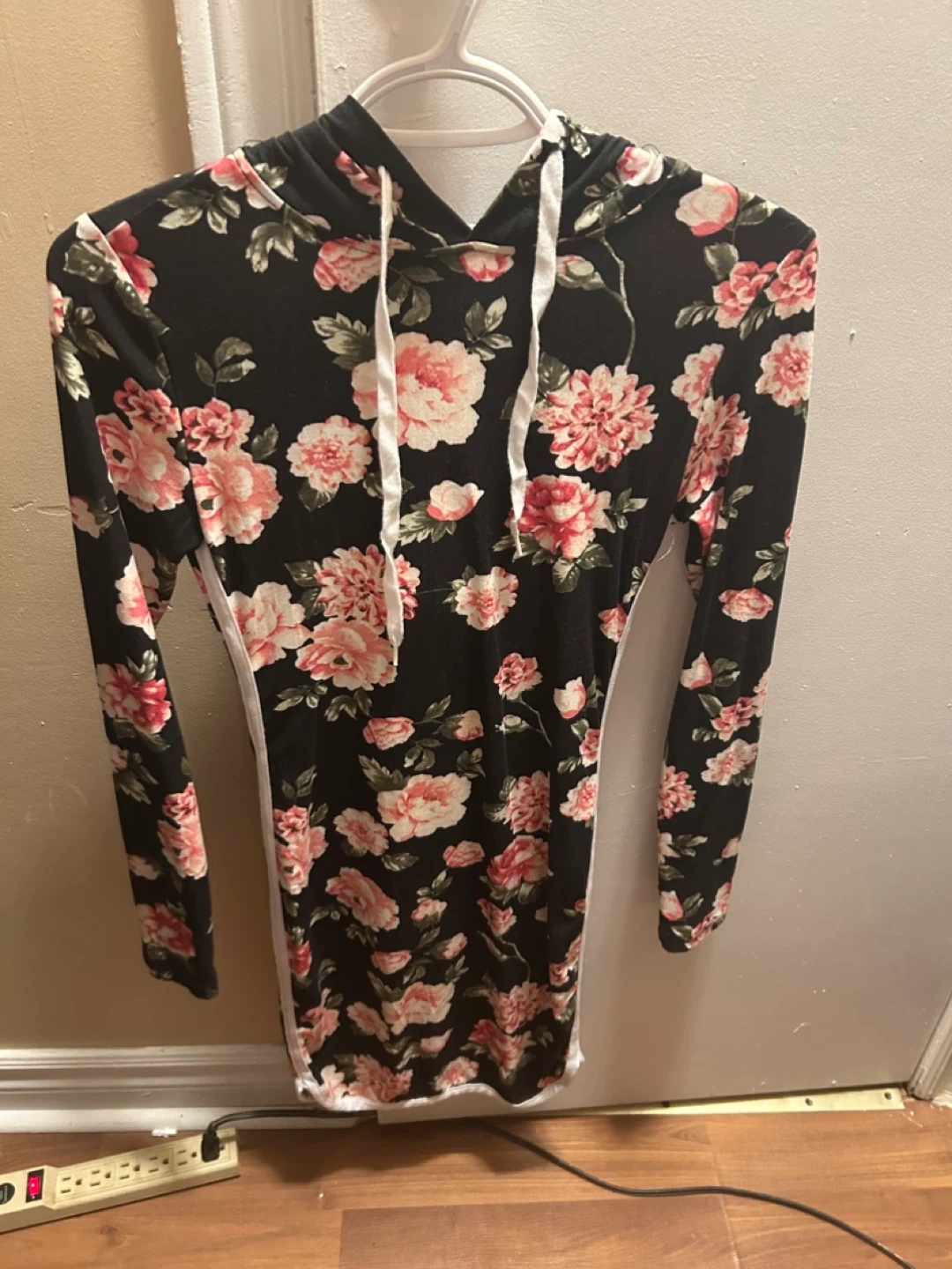 Cute floral print hoodie dress! It's in great condition and would be a lovely addition to your wardrobe. The dress features a black background with a pink and white floral pattern, a hood with white drawstrings, and long sleeves. Perfect for a casual day out or lounging at home