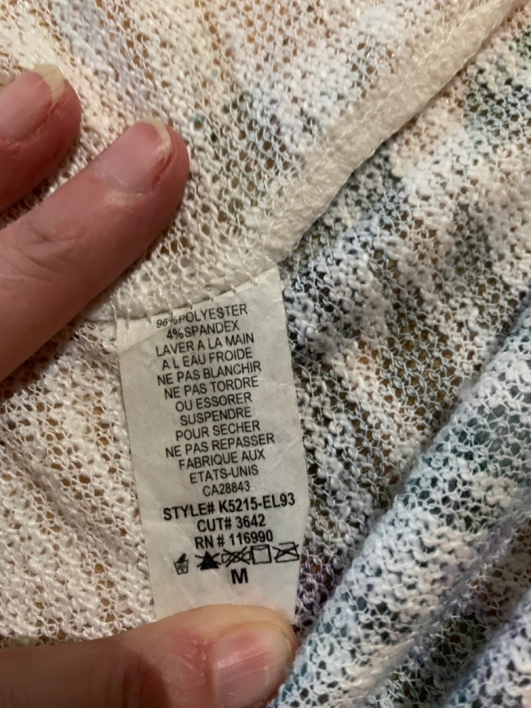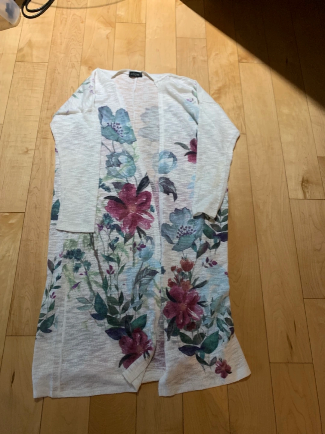 Lightweight long cardigan. Floral pattern. Open front. Long sleeves. Size medium. 96% polyester, 4% spandex. Pickup is Northside