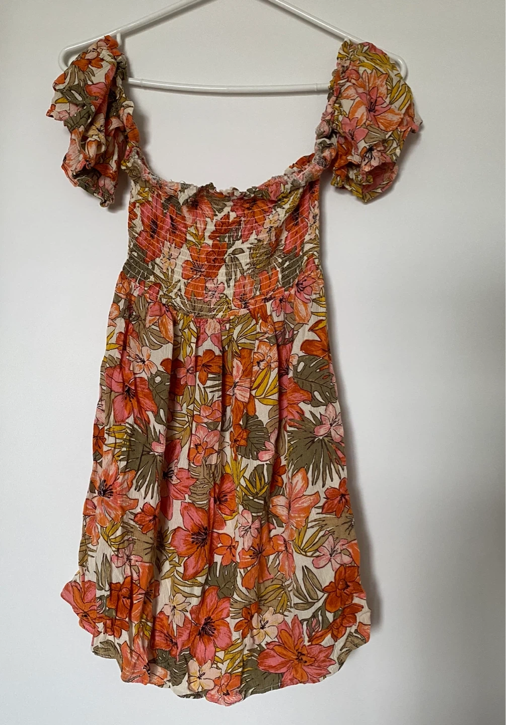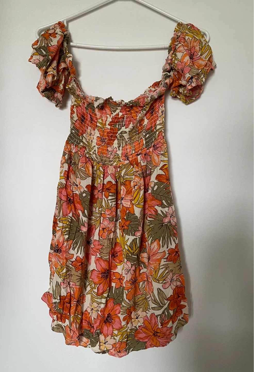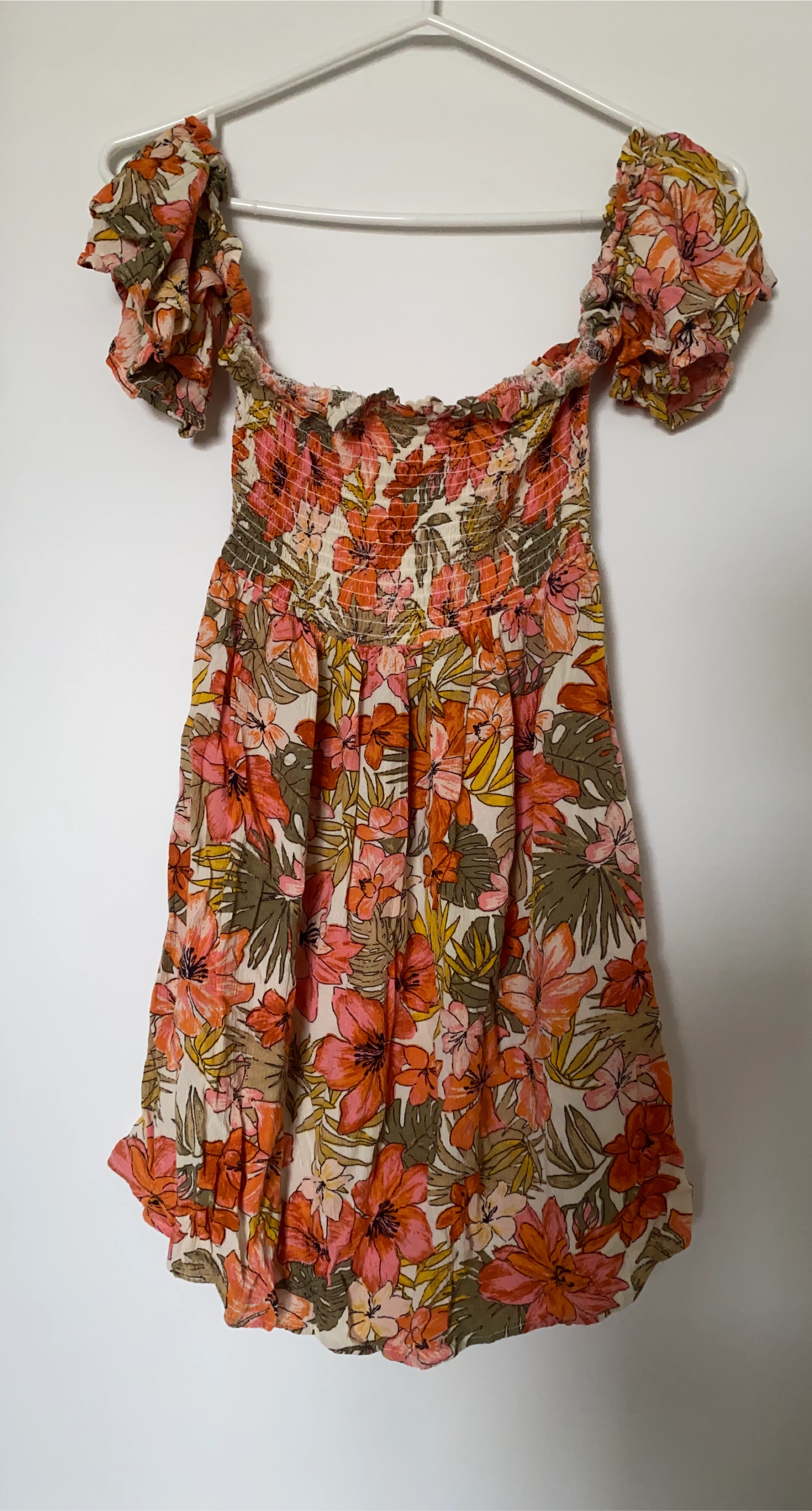 This is a cute off-the-shoulder dress with a colourful floral print! It's perfect for summer days or a casual outing. The dress features a smocked bodice and ruffled sleeves.