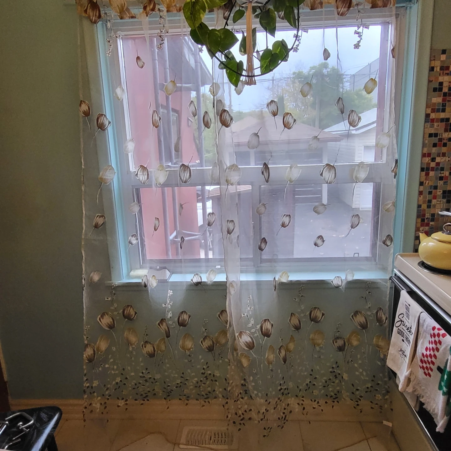 231Add a touch of elegance to your home with this sheer curtain panel! The floral print will let in plenty of light while still providing some privacy. Each panel 80 x 40 inch