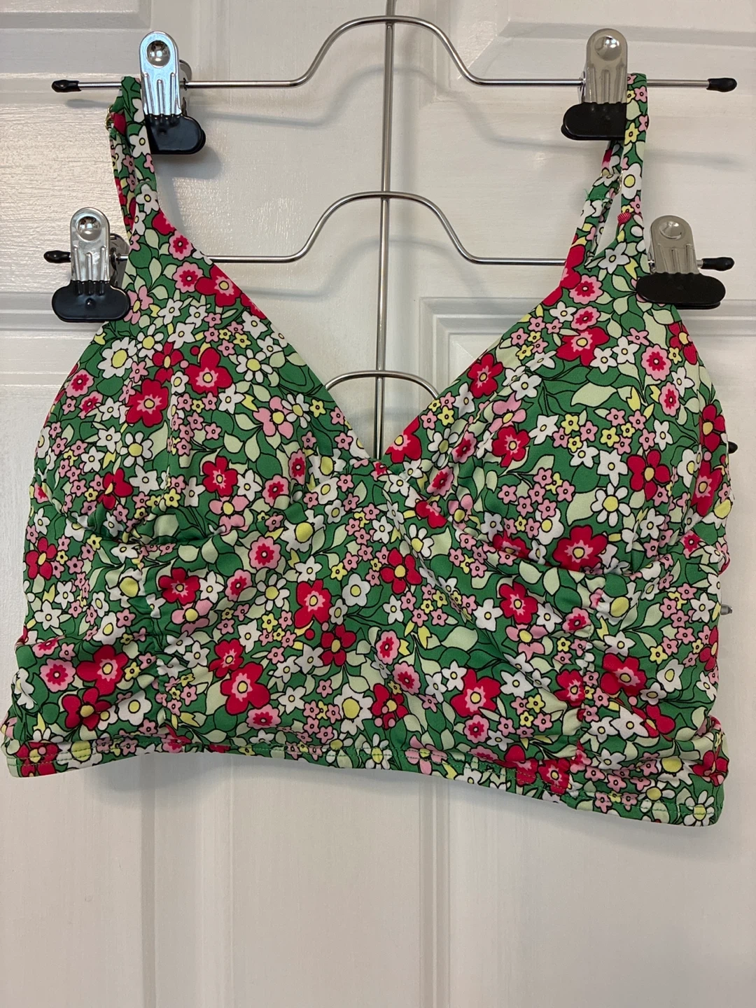 118A cute floral print top! It features a green background with pink, red, and white flowers. Perfect for adding a pop of colour to your wardrobe