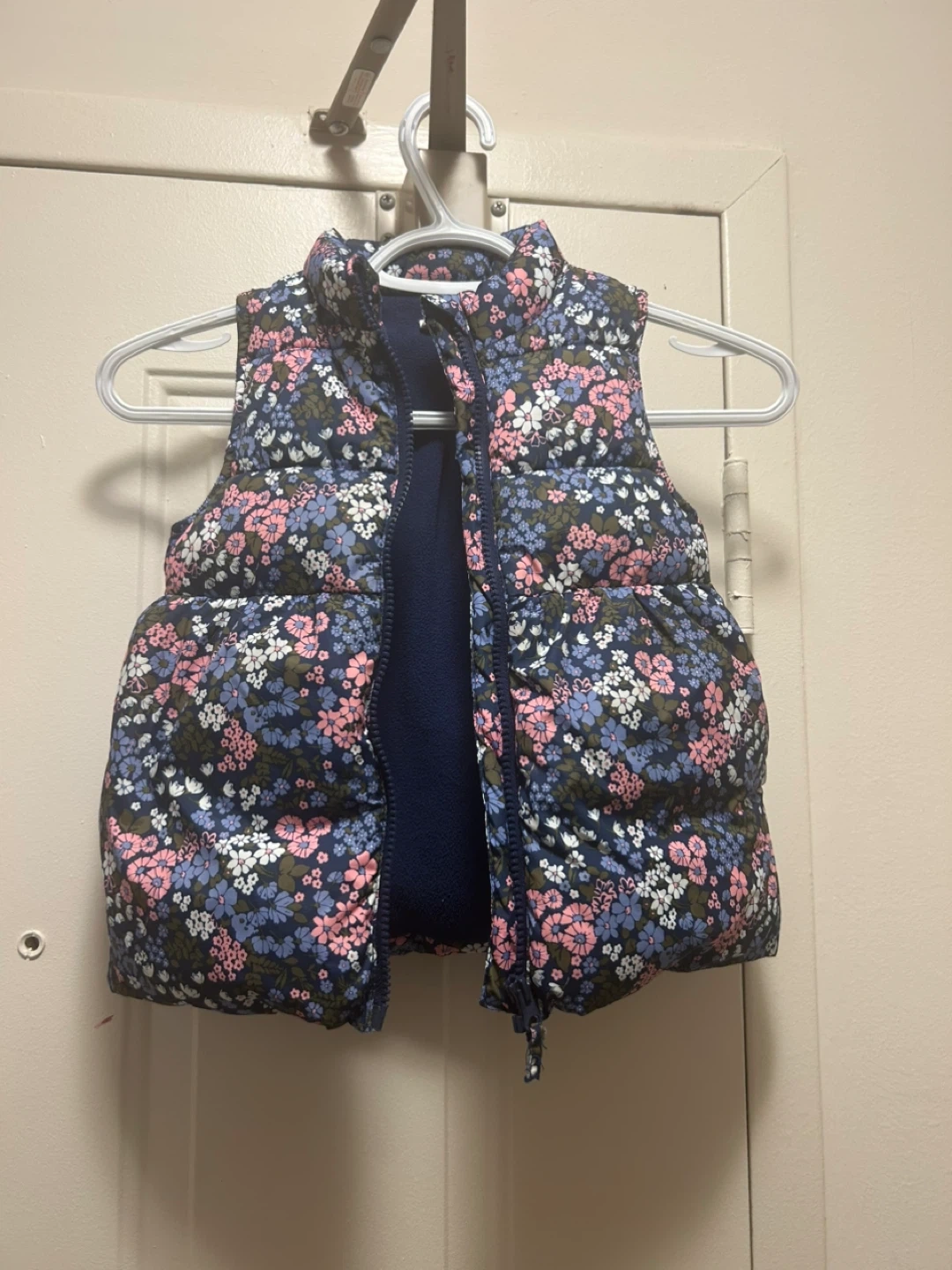 Cute floral puffer vest, perfect for layering on chilly days! The vest features a lovely floral pattern with pink, white, and blue flowers on a navy background. It's in great condition and ready for a new home