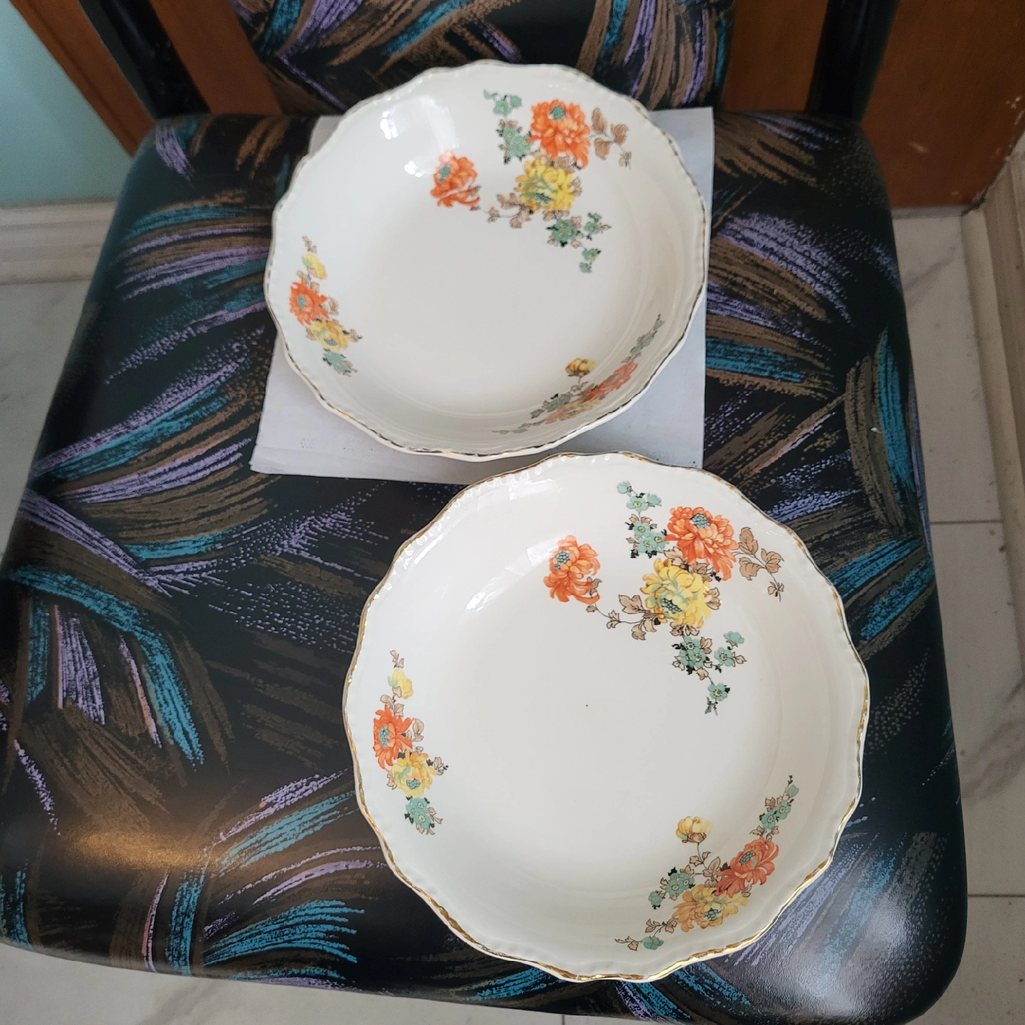 215Selling a set of two floral serving bowls. They feature a lovely floral design with orange, yellow, and green flowers on a white background. Perfect for serving salads, side dishes, or desserts! These bowls are in great condition and ready for a new home