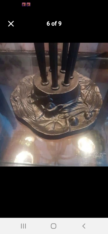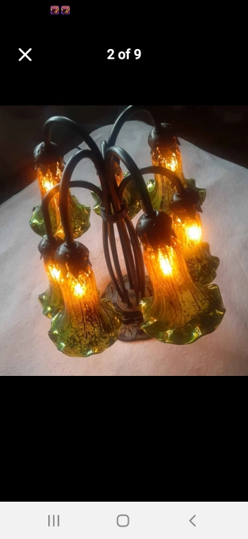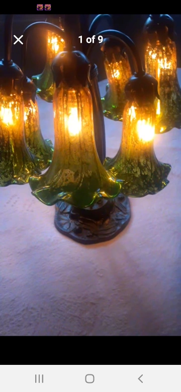 This is a beautiful accent lamp with a floral style. It has a dark metal base and green and amber coloured glass shades. It would look great in any room!