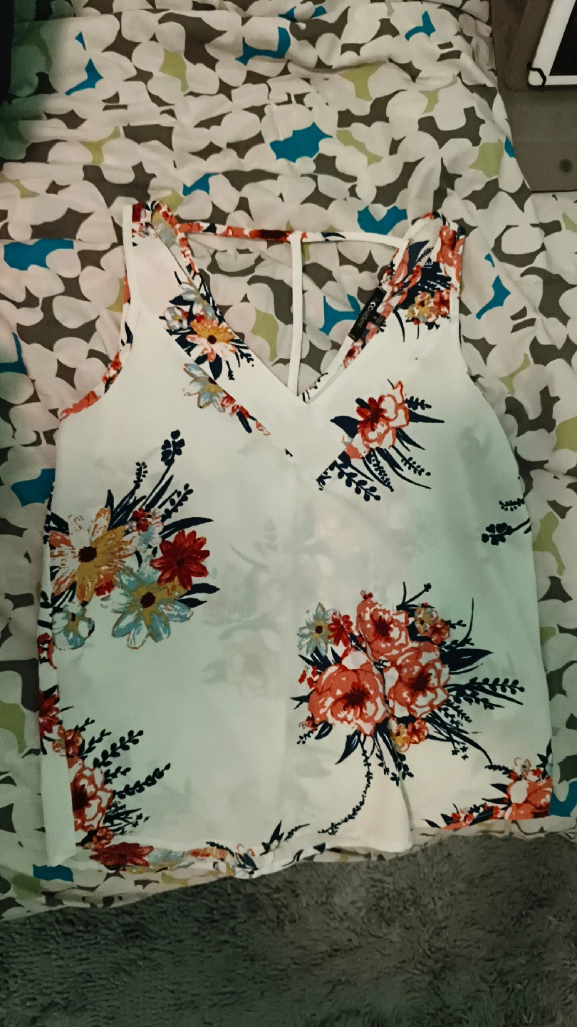 153Selling a lovely floral tank top in size medium! It's a white top with a colourful floral pattern. Perfect for a casual summer day!