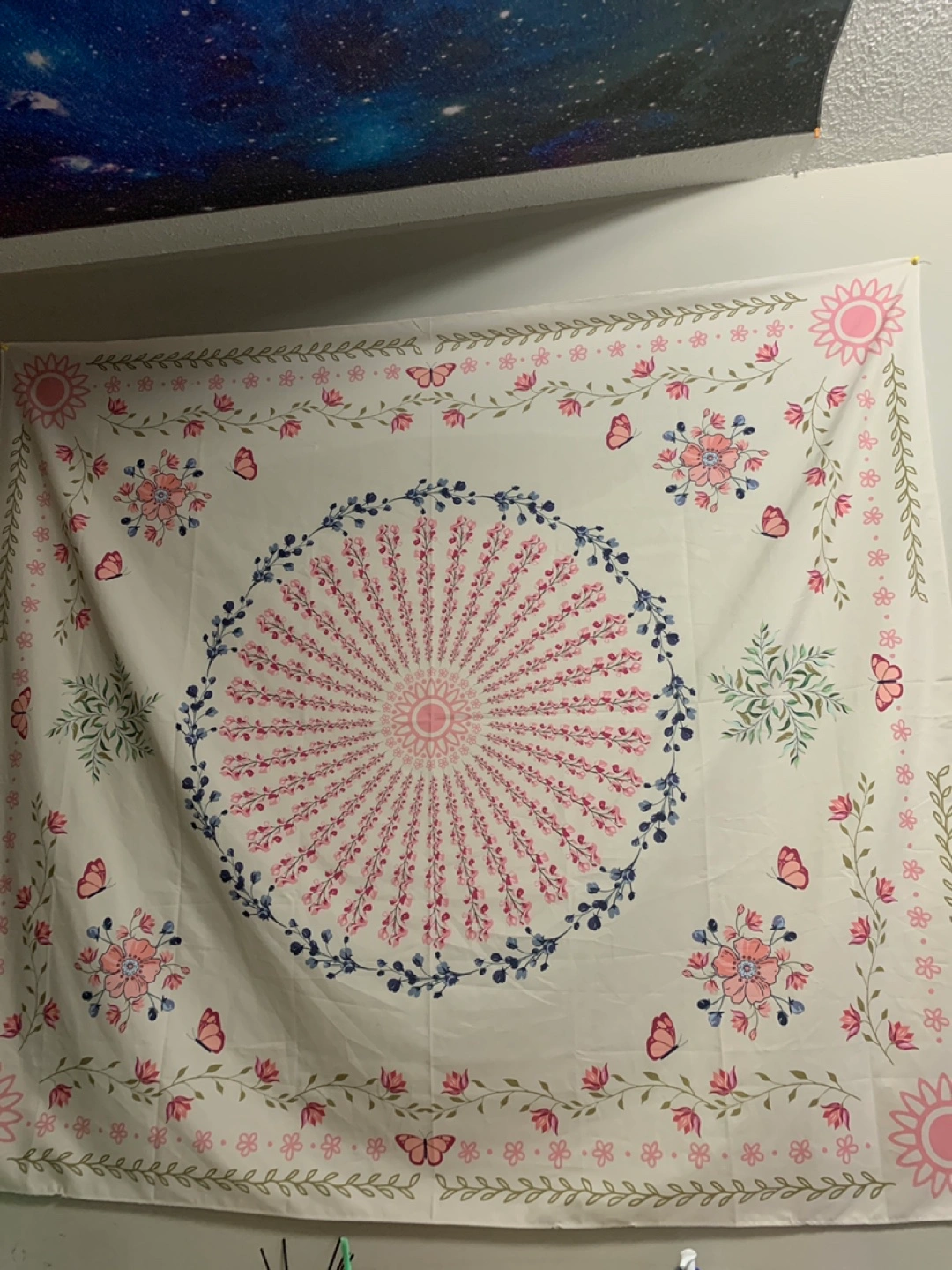 A beautiful wall tapestry. Featuring a central design surrounded by floral and butterfly detailing. Would make a lovely addition to any room, perfect for creating a peaceful atmosphere.