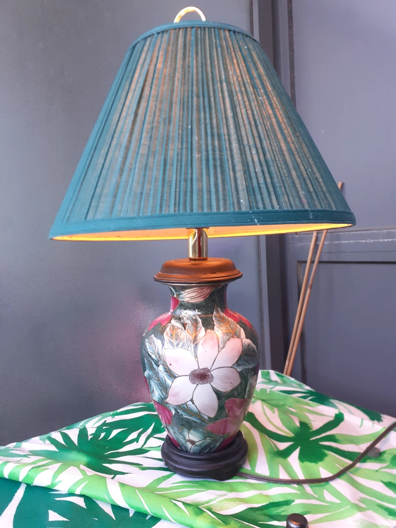 Here's a lovely table lamp featuring a floral vase base and a green pleated shade. It would be a great addition to any room!