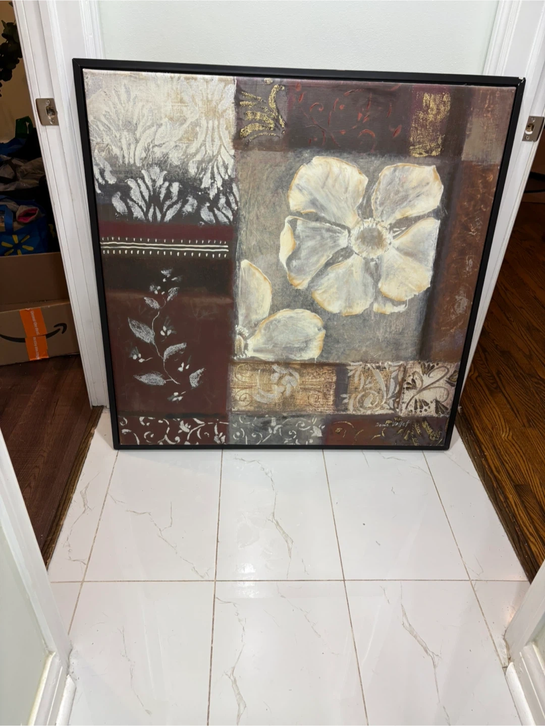 0Selling a framed floral wall art piece. It features a lovely floral design with a mix of neutral and warm tones, perfect for adding a touch of elegance to any room. The frame is black and in good condition. It's ready to hang and will instantly enhance your home decor! 50$ each or both for 80$