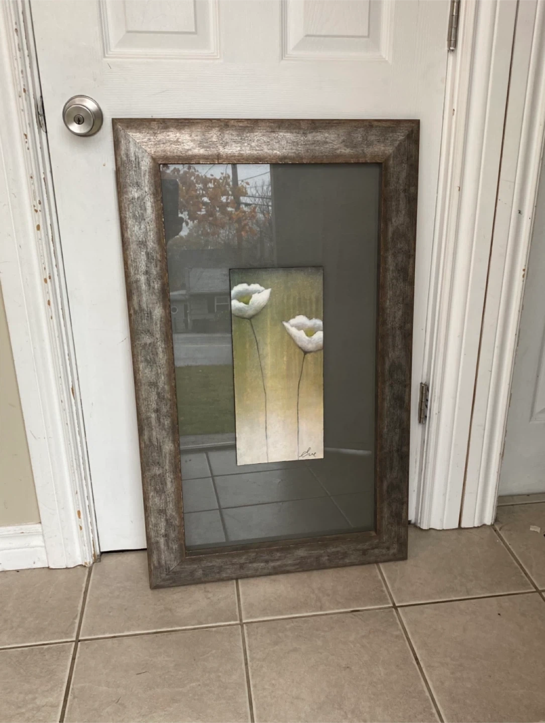 73• 36”L x 21.5”W x .75”D • wood frame • raised flower panel on glass • professionally framed Clean … very good condition