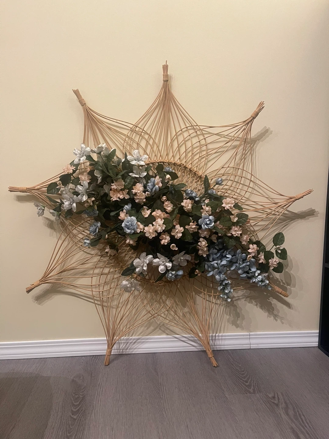 10Selling a unique floral wall decoration! It features a starburst-shaped frame made of natural-looking material, adorned with delicate artificial flowers in shades of white and blue. A lovely piece to add a touch of nature and whimsy to your home
