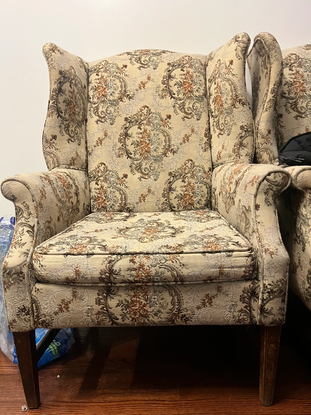 (Set of two ) meet at 1910 lakeshore blvd w. Selling a lovely floral wingback armchair. It's in good condition and would be a great addition to any living room or reading nook. The chair features a classic floral pattern on a beige background. It has a comfortable seat and supportive back, perfect for relaxing