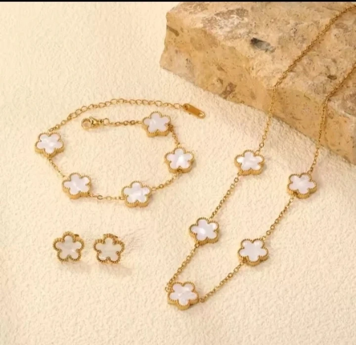 20This is a beautiful matching jewelry set with a flower design! It includes a necklace, bracelet, and a pair of earrings. The set is gold-toned with white flower accents. Perfect for adding a touch of elegance to any outfit