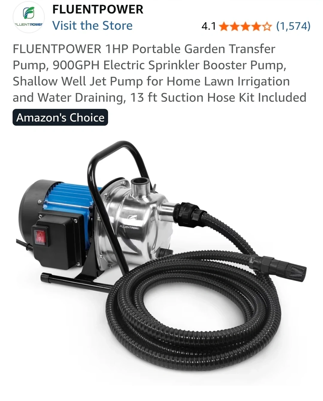 91Selling a FLUENTPOWER 1HP portable garden transfer pump! This pump is a 900GPH electric sprinkler booster pump and a shallow well jet pump, perfect for home lawn irrigation and water draining. It also comes with a 13 ft suction hose kit