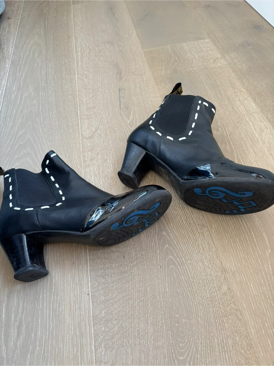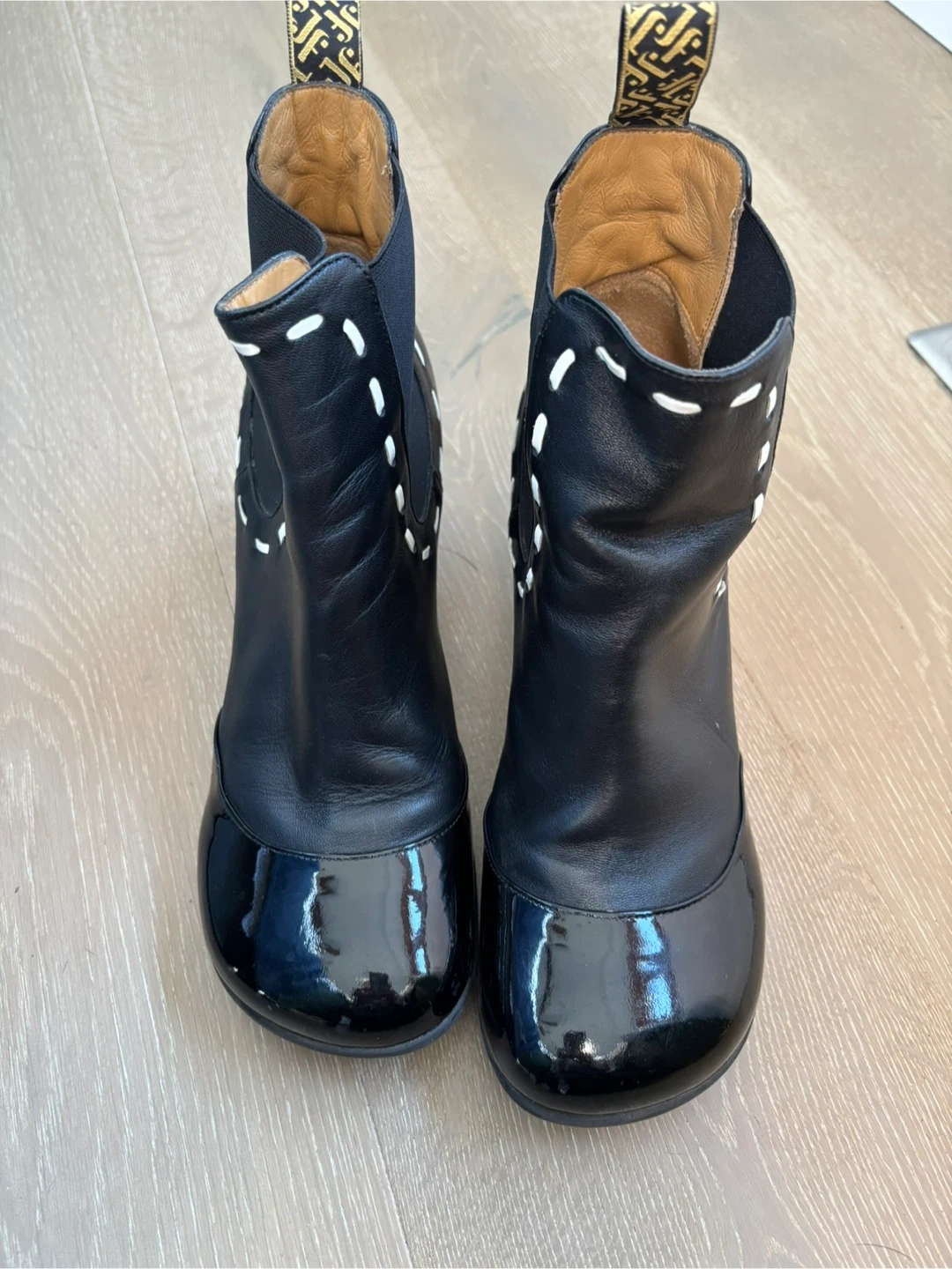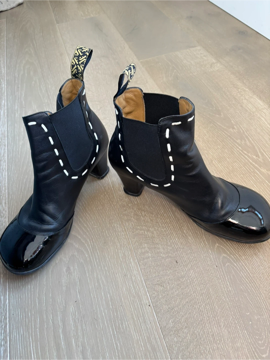 These are a pair of Fluevog Nilsson black leather ankle boots in a size 11, with box and bag. They feature a glossy patent leather toe cap and white stitching detail. The heel is a comfortable height for everyday wear. They are in great condition and ready for a new home!