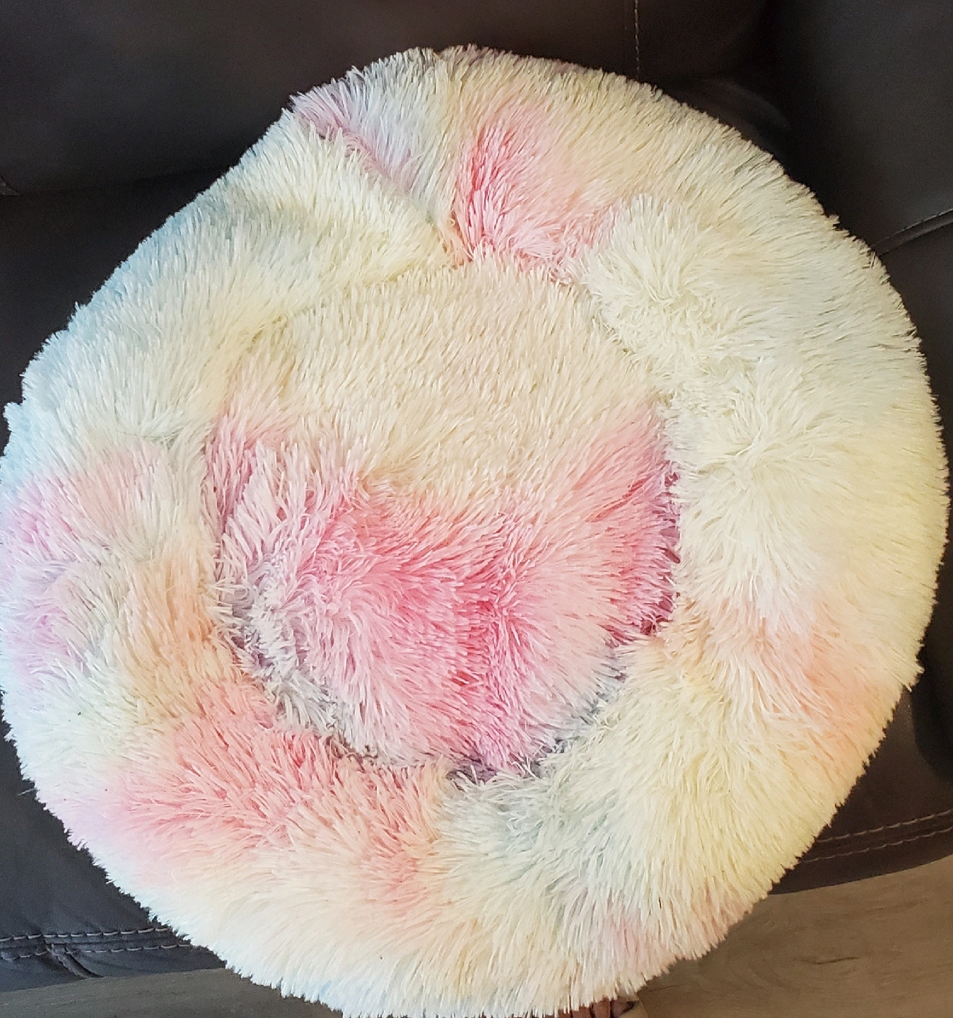 24Selling a cozy, fluffy round pet bed! It features a soft, plush material in a lovely pink and white colour combination. Your furry friend will love snuggling up in this comfy bed. My cat did not use it at all.