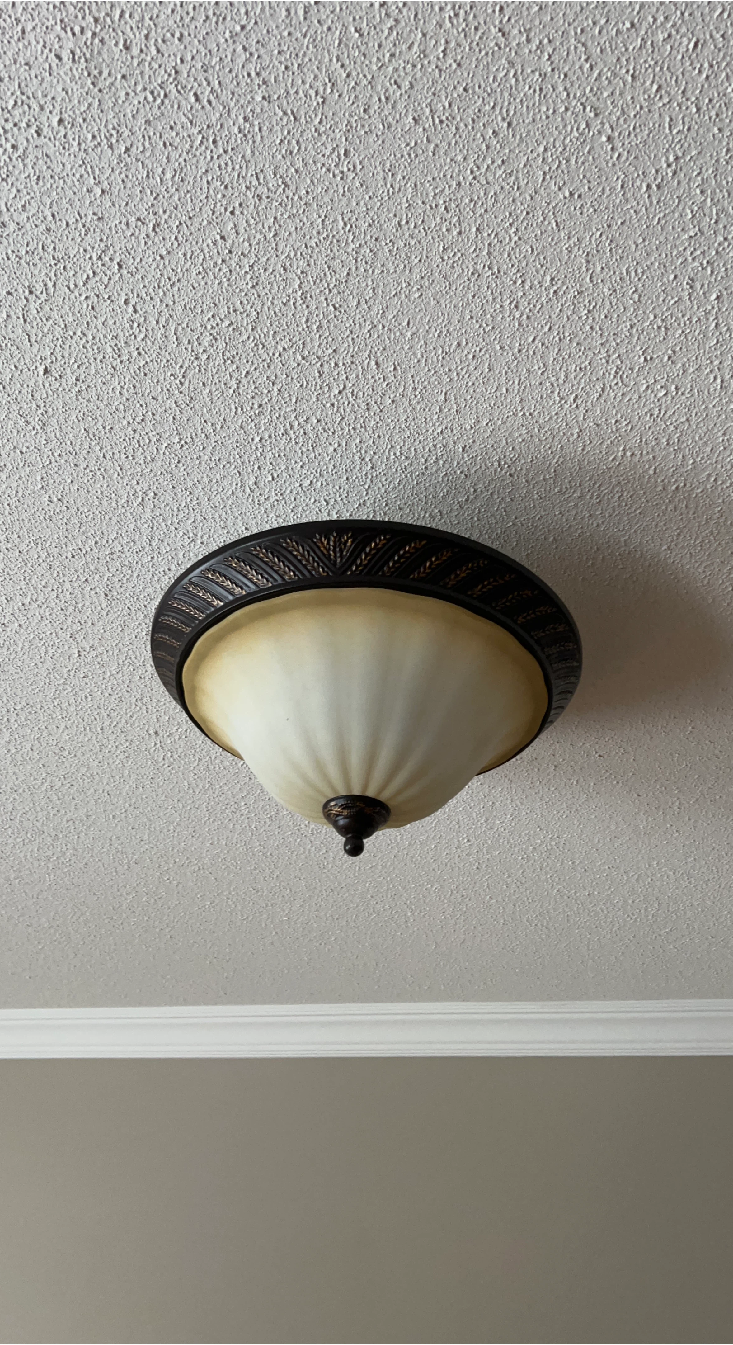 10Selling a flush mount ceiling light fixture. It has a decorative bronze-coloured trim and a frosted glass shade. It's in great shape and ready to brighten up your space!