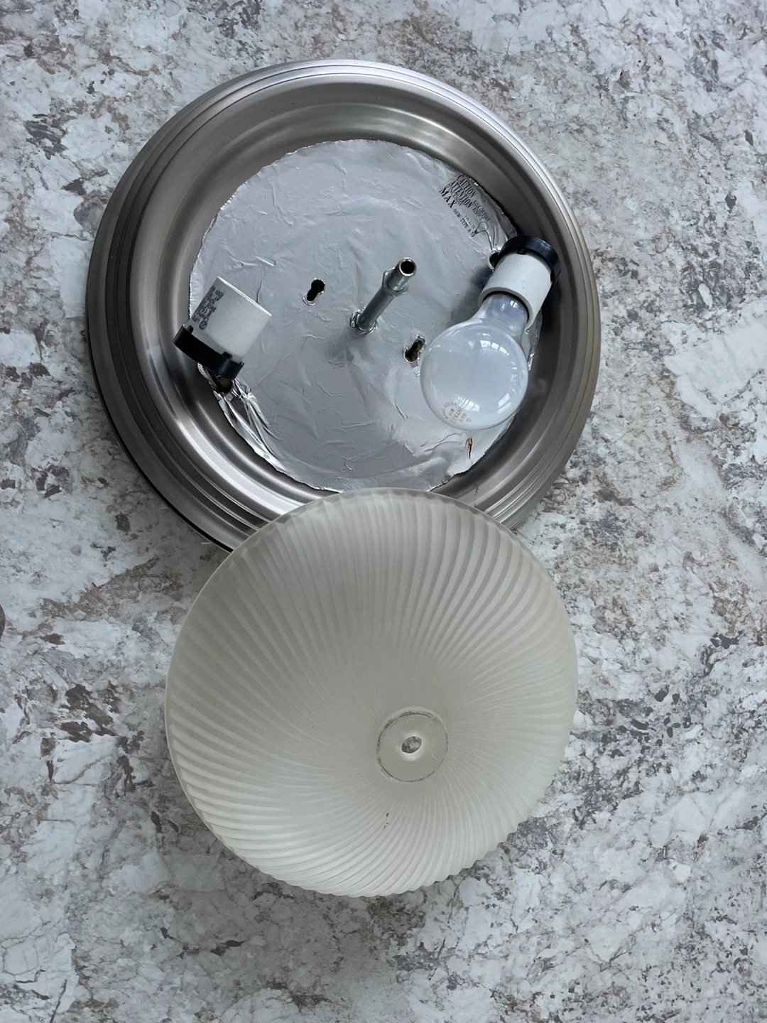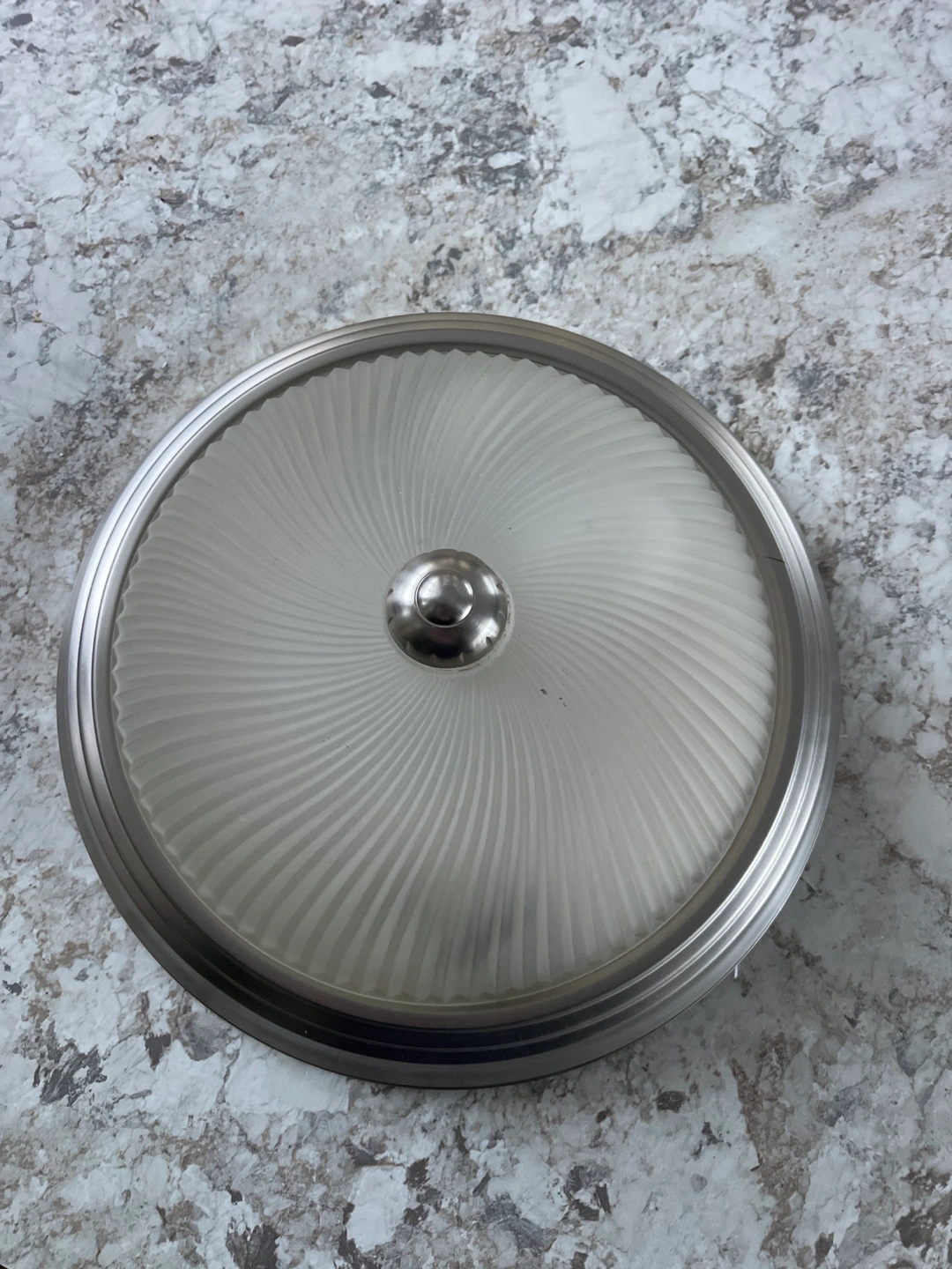 15Silver ceiling light fixture with a frosted glass shade. Includes mounting plate, hardware, and lightbulb. I have 4 of them . Price for each piece