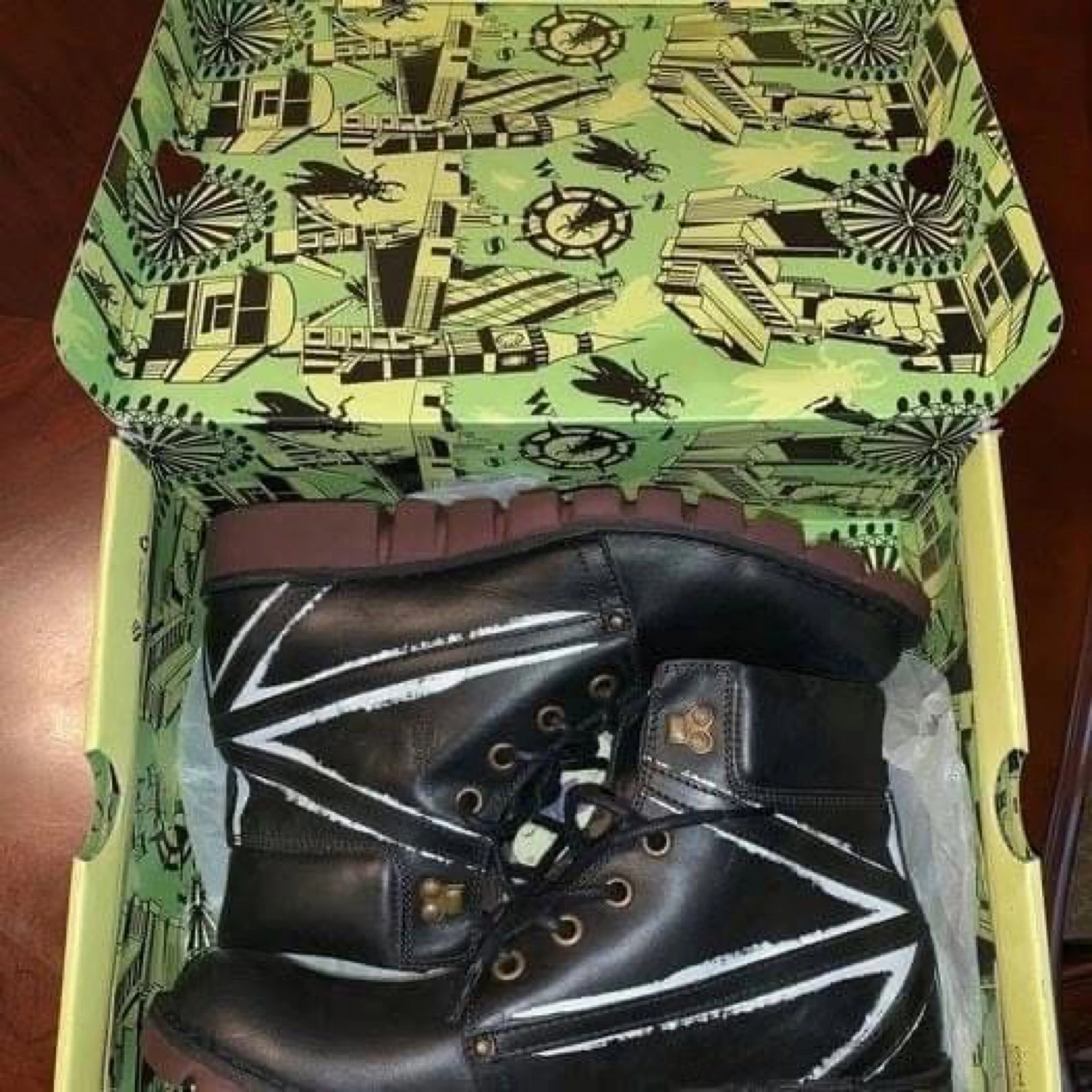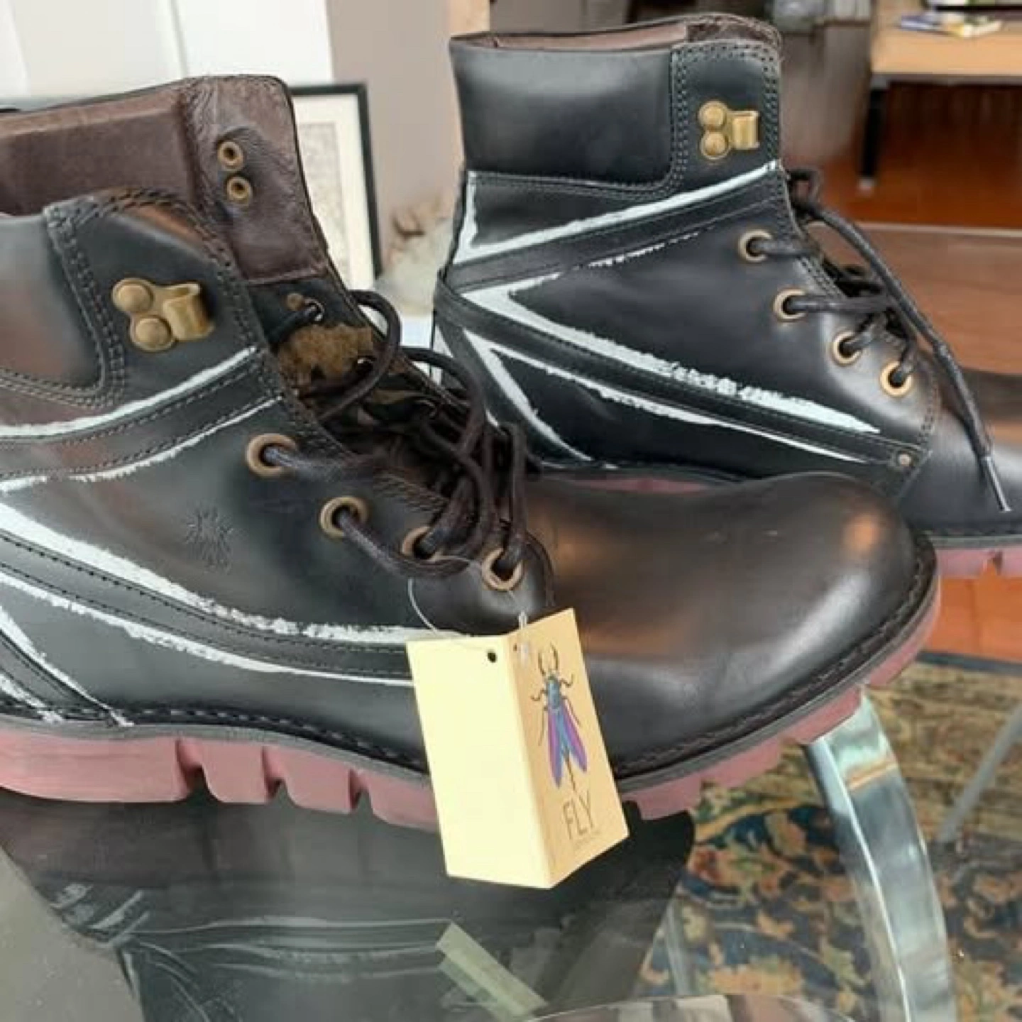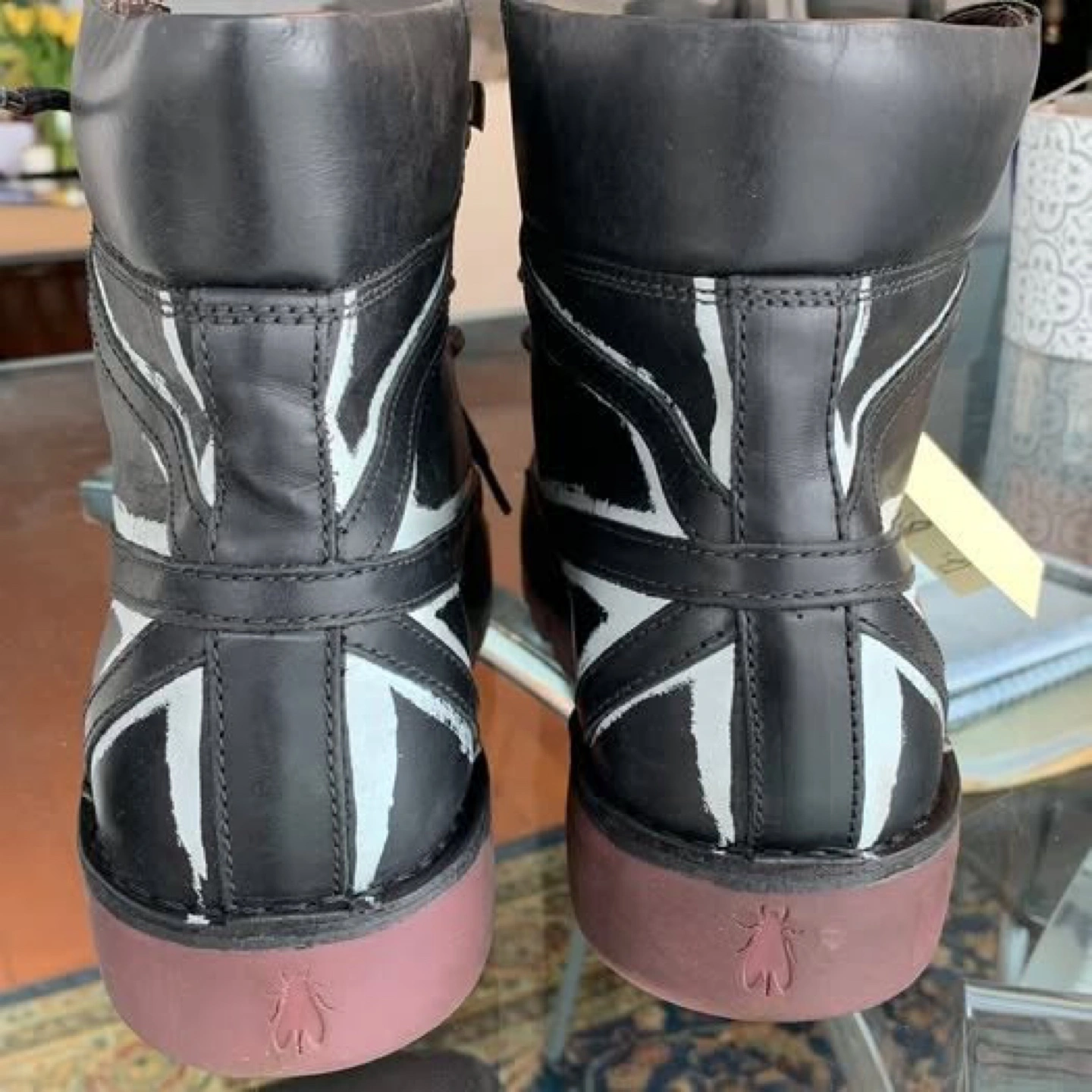 Brand new black leather boots with Union Jack design. Comes in original box.