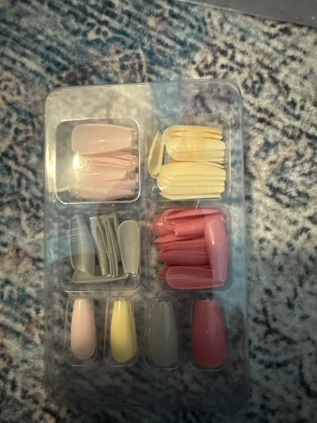 This is a set of press-on false nails in various colours. The package contains multiple sets of nails in different shades of pink, yellow, and grey. They're coffin-shaped. This kit is useful for quick nail makeovers.