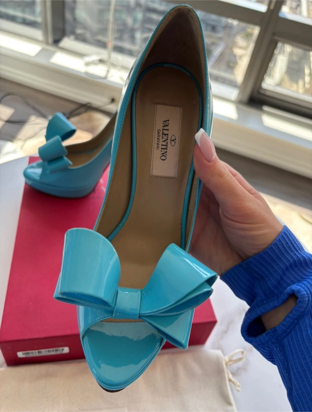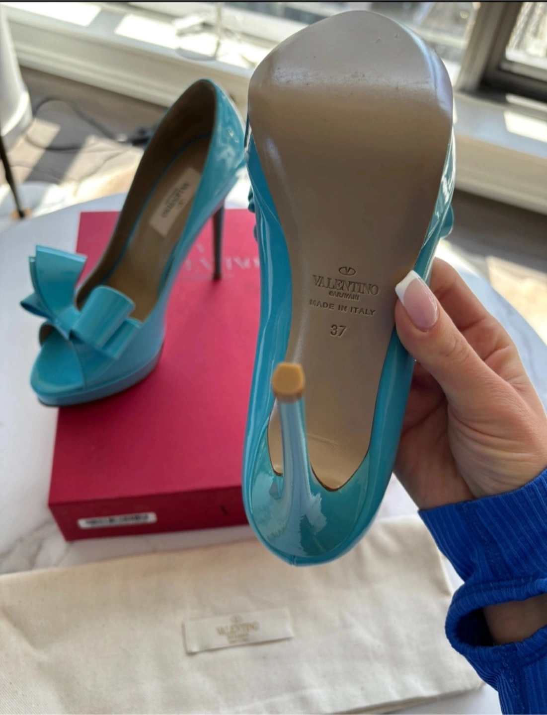 Valentino Garavani Blue Patent Leather Bow Heels, Size 37