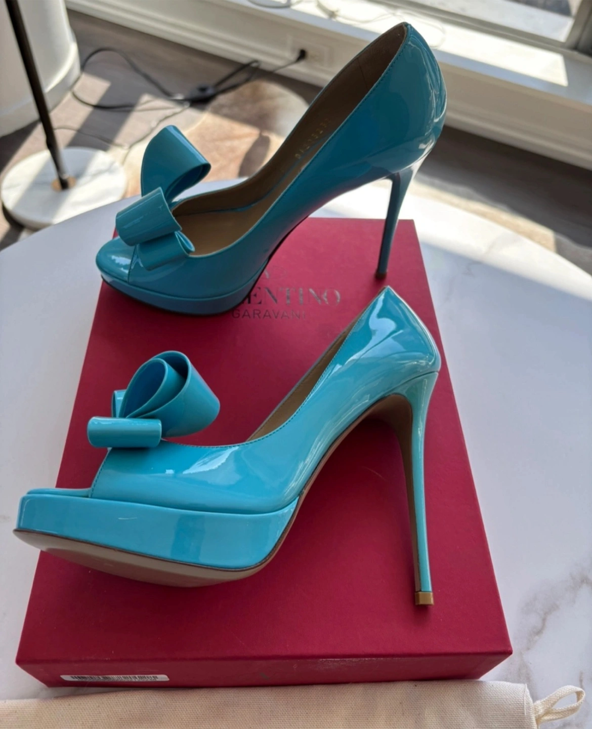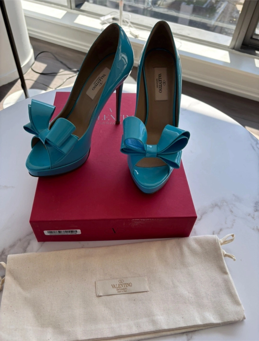 Pre-owned Valentino Garavani peep-toe platform pumps. Beautiful light blue patent leather. Large bow detail. Size 37. Comes with dust bag and original box.