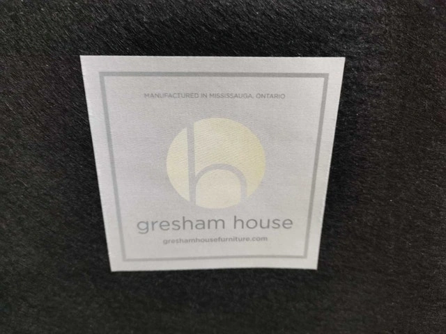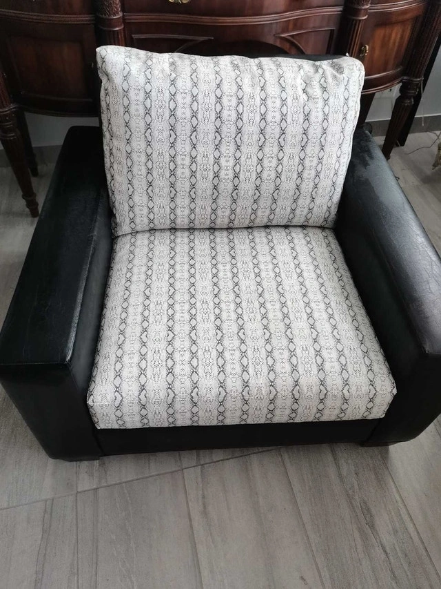 This Gresham House chair with matching ottoman is ideal for adding a touch of style and comfort to any living space, featuring a sleek black leatherette frame and contemporary patterned cushions, providing both aesthetic appeal and relaxation. This set has signs of wear.