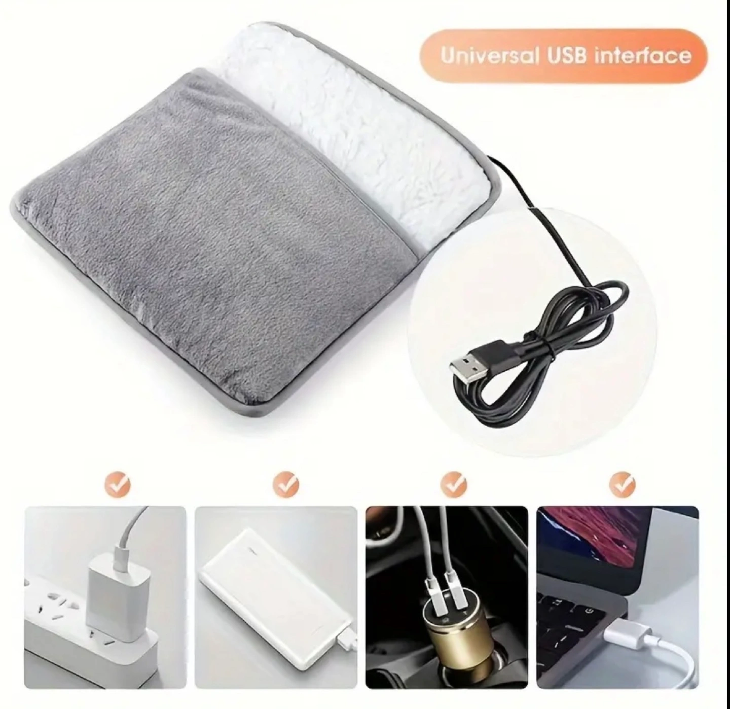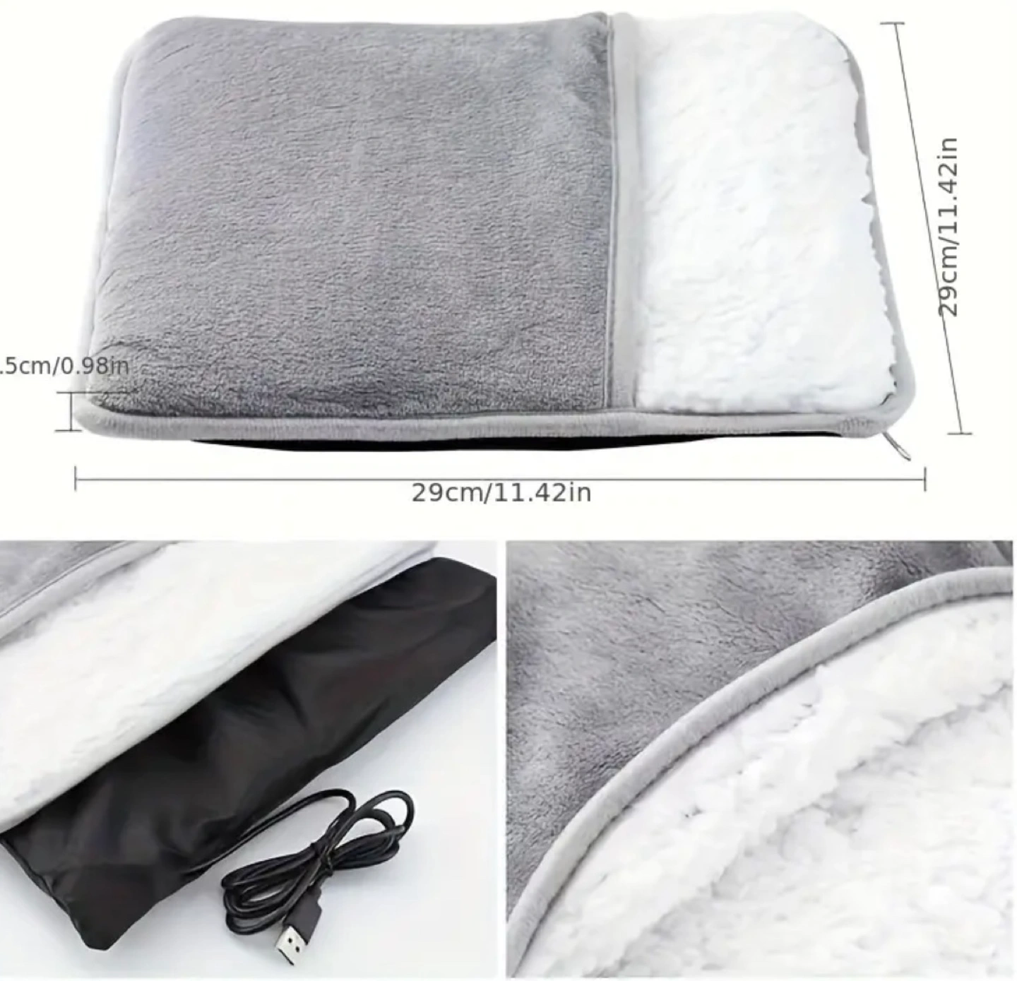 Cozy fleece-lined feet warmer. USB powered. Perfect for cold weather. Includes USB cable. Portable and convenient.
