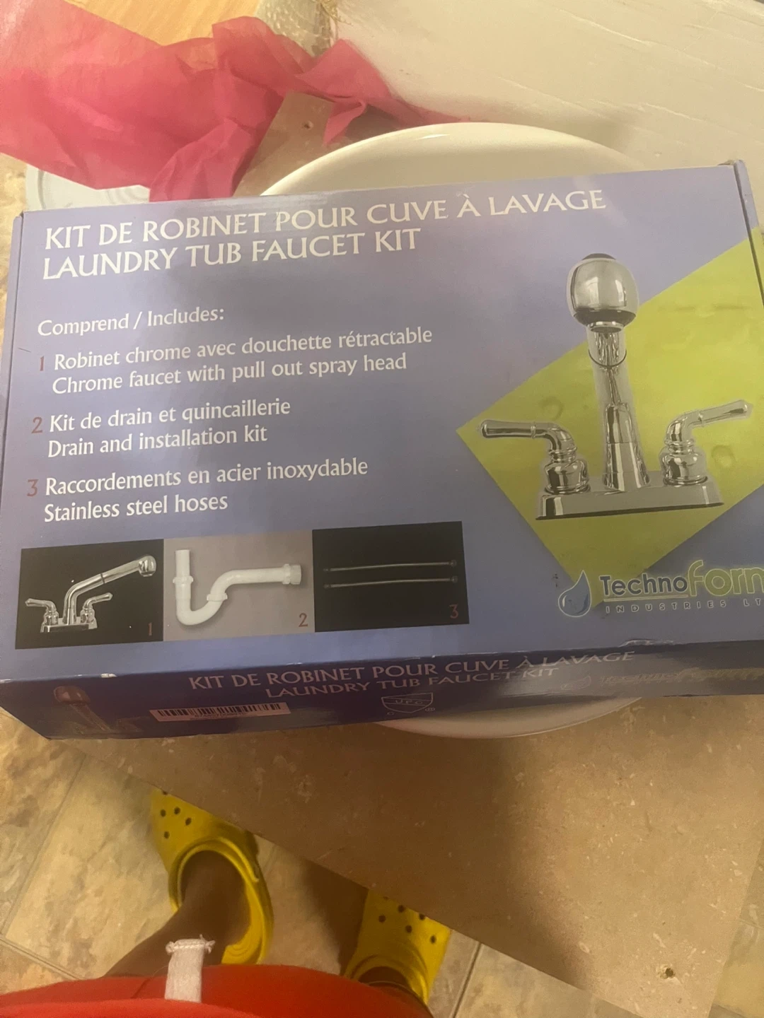 This is a laundry tub faucet kit with a chrome faucet and pull-out spray head. It includes a drain and installation kit. Stainless steel hoses are also provided.