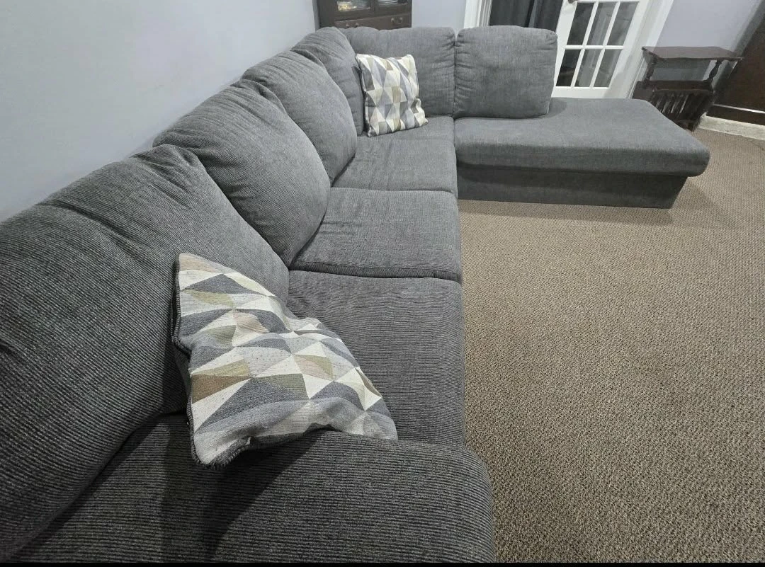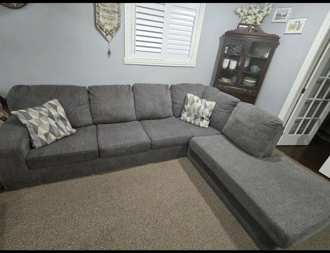 Spacious grey sectional sofa. Upholstered in a durable fabric. Includes two decorative throw pillows. I took very good care of this is bought it for 1,500 I have proof. Selling because I am going to my home country hoping I could get someone to buy it!.