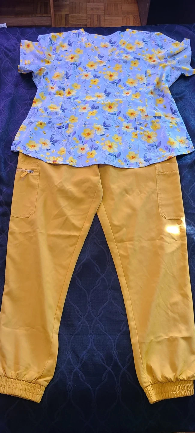 This is a scrub set featuring a light blue top with a yellow floral print and matching yellow jogger pants. The top has a V-neck and short sleeves. The pants have a drawstring waist and elastic cuffs. They're comfortable for everyday wear.