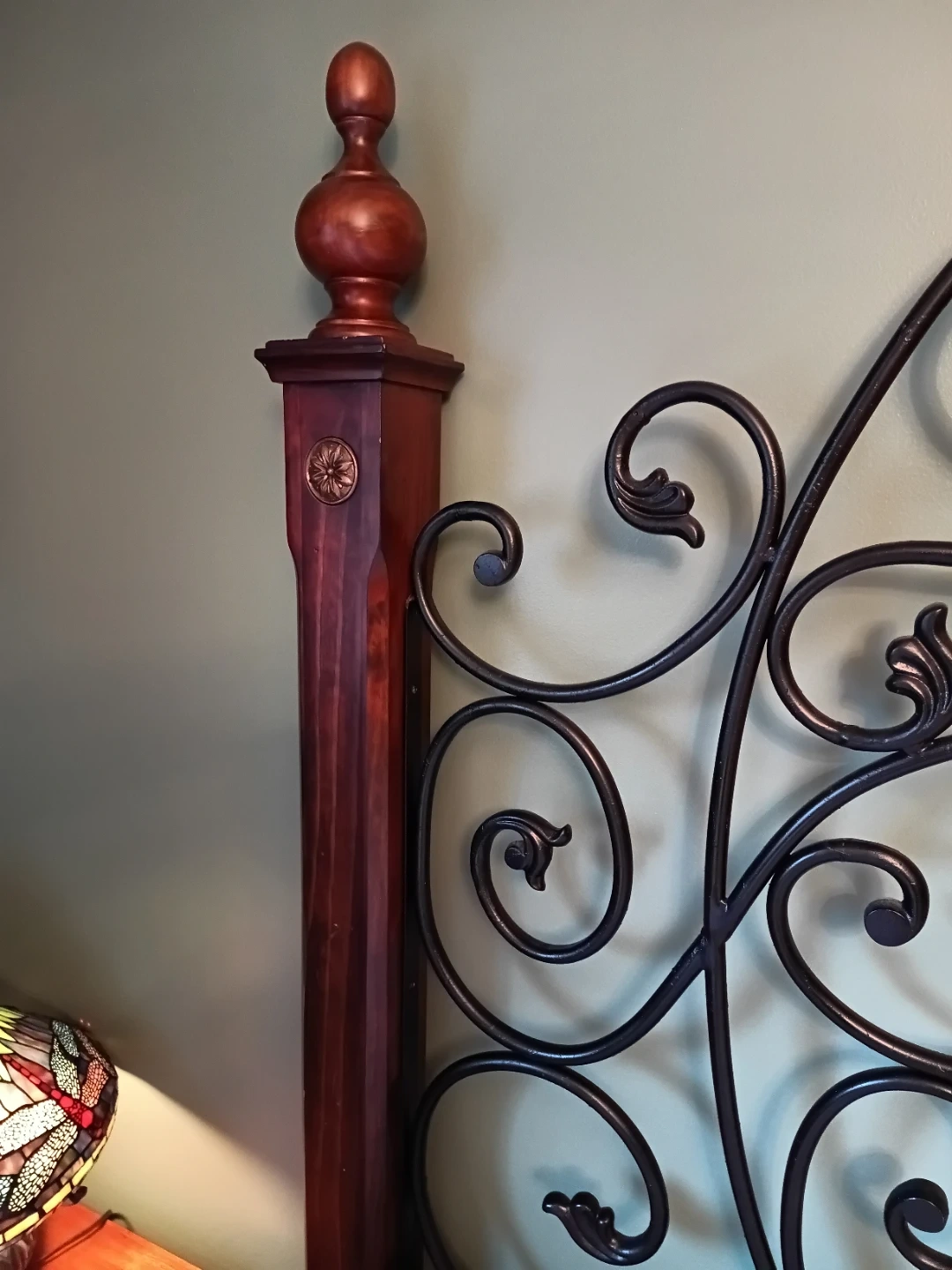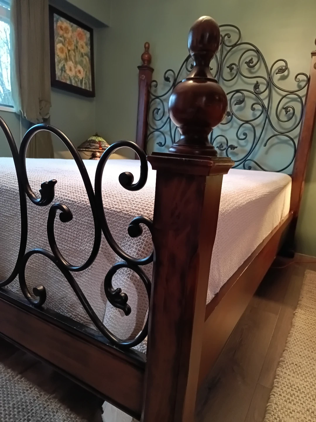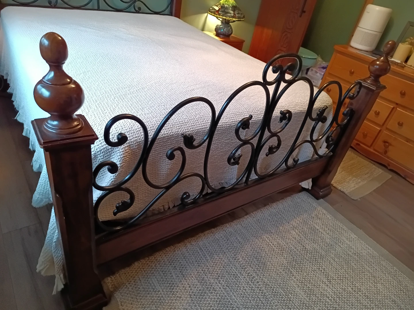 This is a beautiful iron and wood bed frame. It features solid wood construction with decorative metal scrolled inlays.The frame rails and posters are dark wood with accents.