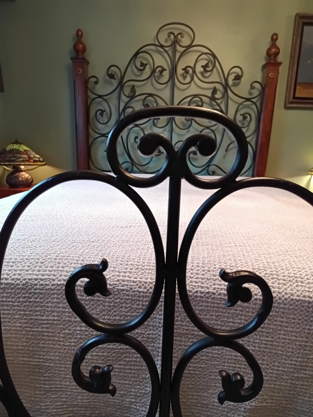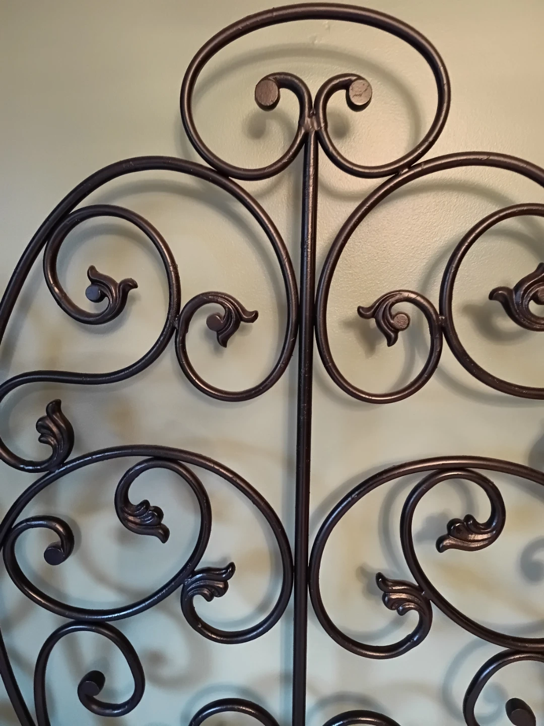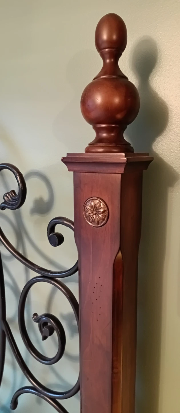 This is a beautiful iron and wood bed frame. It features solid wood construction with decorative metal scrolled inlays.The frame rails and posters are dark wood with accents.