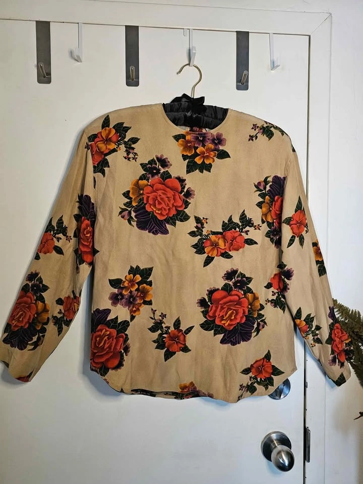 Size 10 100% Silk Vintage Tan Beige Rose Floral Long Sleeve Top