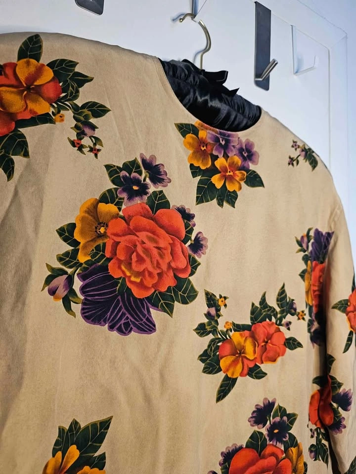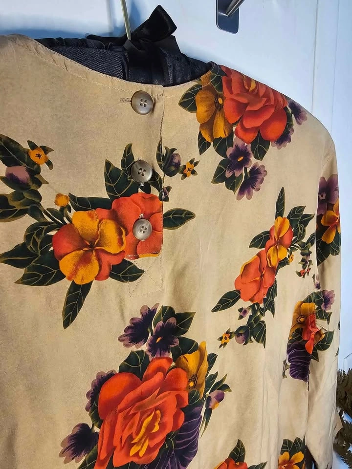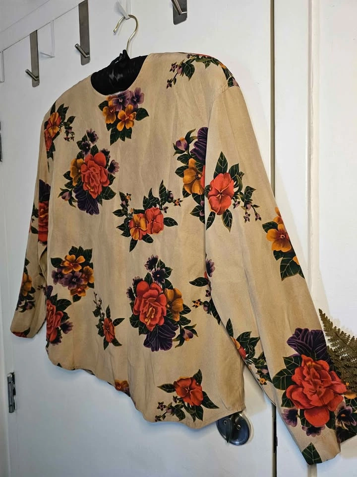 Elegant 100% silk Liz Claiborne long sleeve top, featuring a vibrant floral design in warm green, purple, orange and pink hues on a beige background. Top has a round neck that fastens at the back with tan buttons. The sleeves also cinch in at the hem with buttons for a more fitted look.