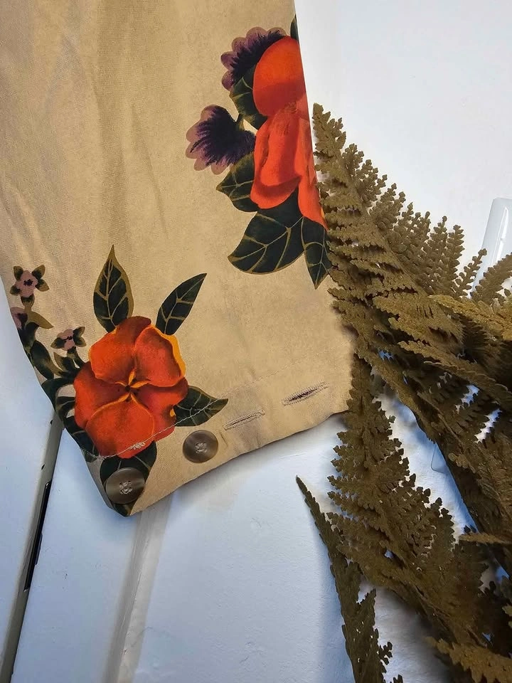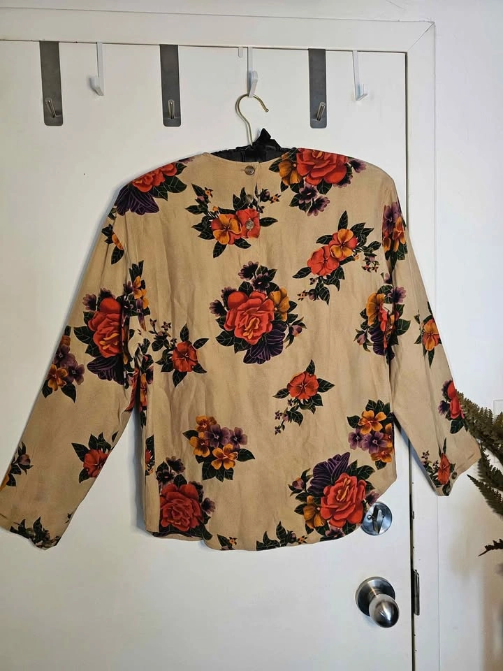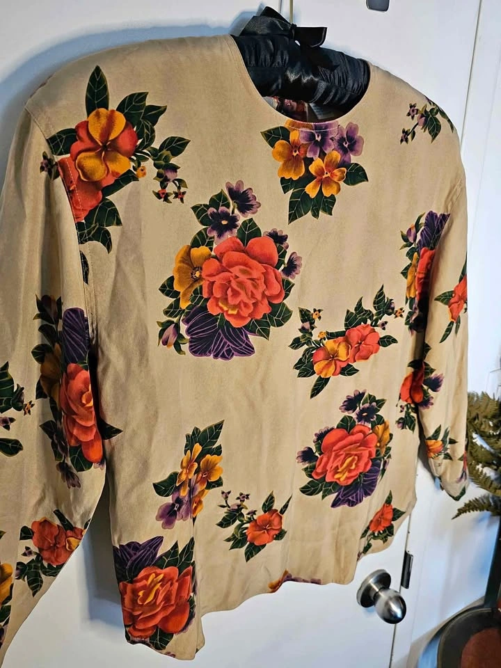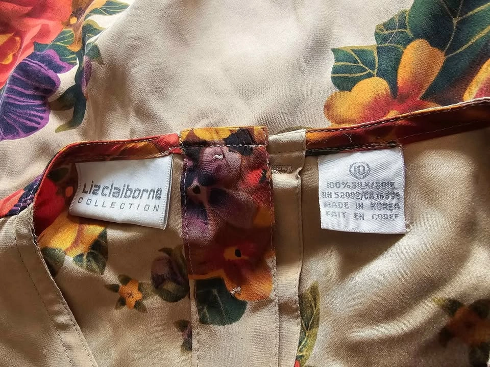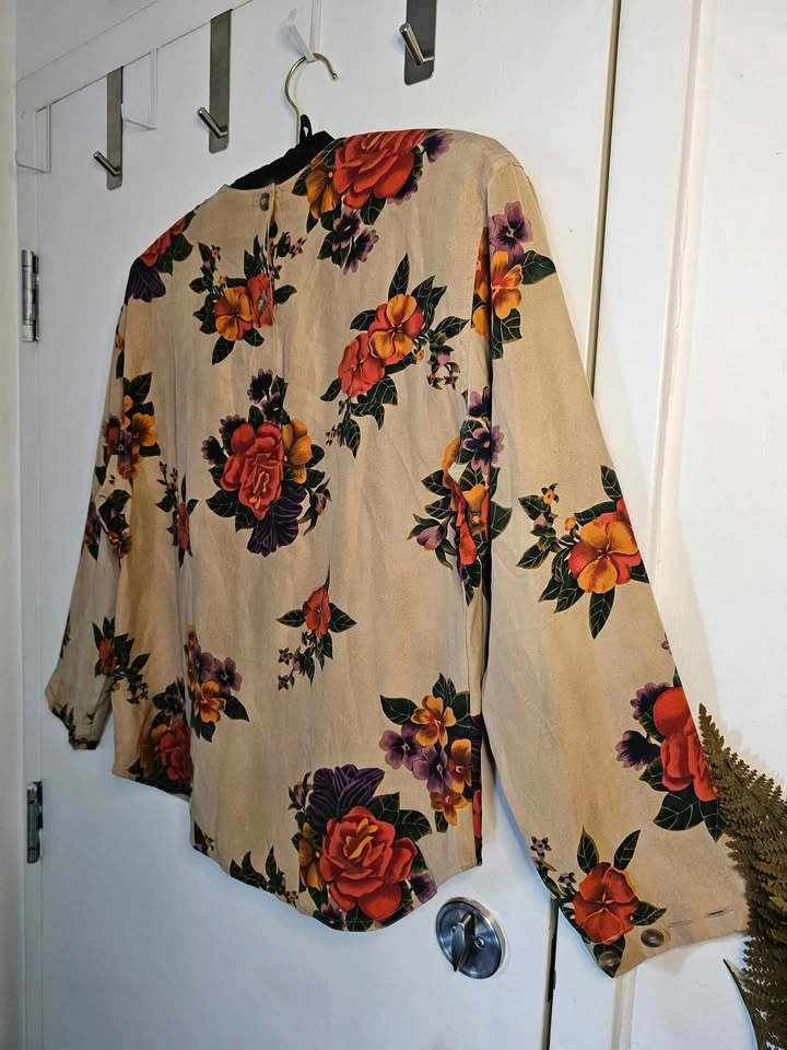Elegant 100% silk Liz Claiborne long sleeve top, featuring a vibrant floral design in warm green, purple, orange and pink hues on a beige background. Top has a round neck that fastens at the back with tan buttons. The sleeves also cinch in at the hem with buttons for a more fitted look.