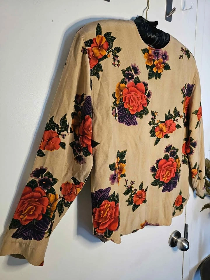 Size 10 100% Silk Vintage Tan Beige Rose Floral Long Sleeve Top