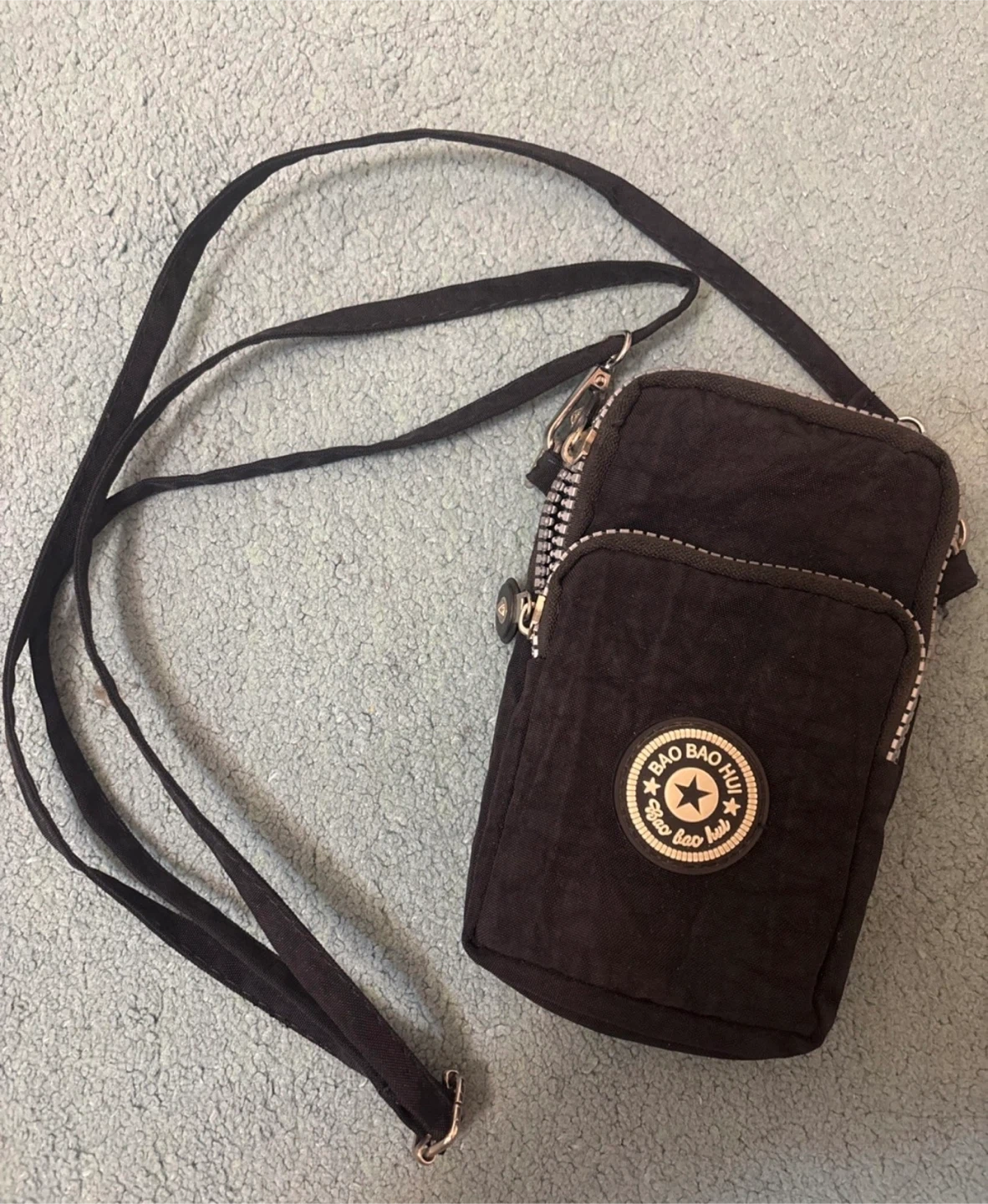 This Bao Bao Hu crossbody bag is black and a small size, perfect for carrying essentials. Comes with de-attachable strap and arm strap perfect for storing your phone when running!