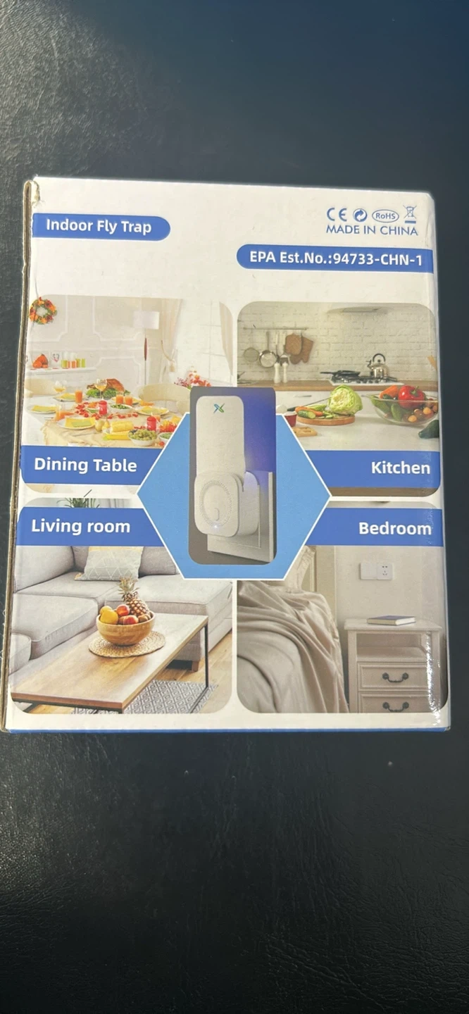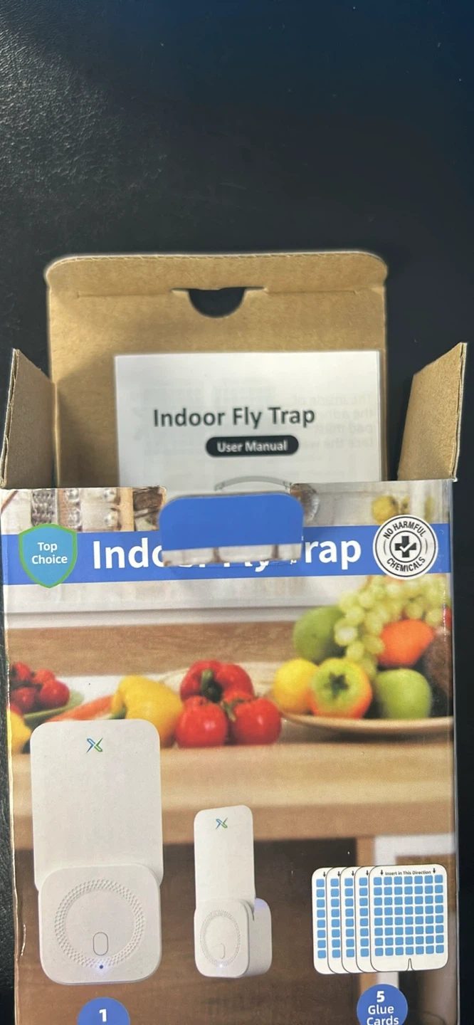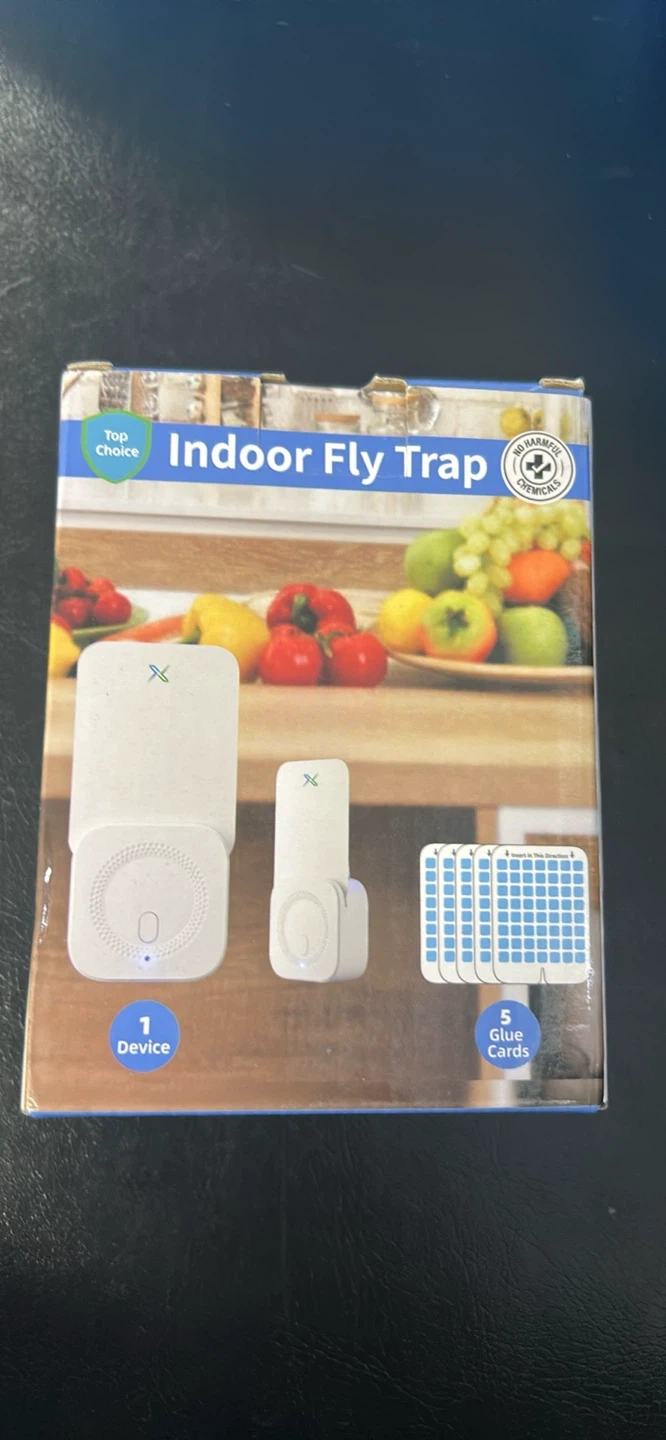 This is an indoor fly trap designed to catch moths, gnats, flies, and fruit flies. It comes with one device and five glue cards. It's a chemical-free way to deal with flying insects in your home.